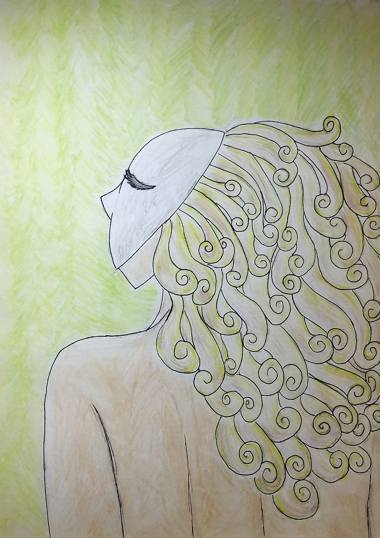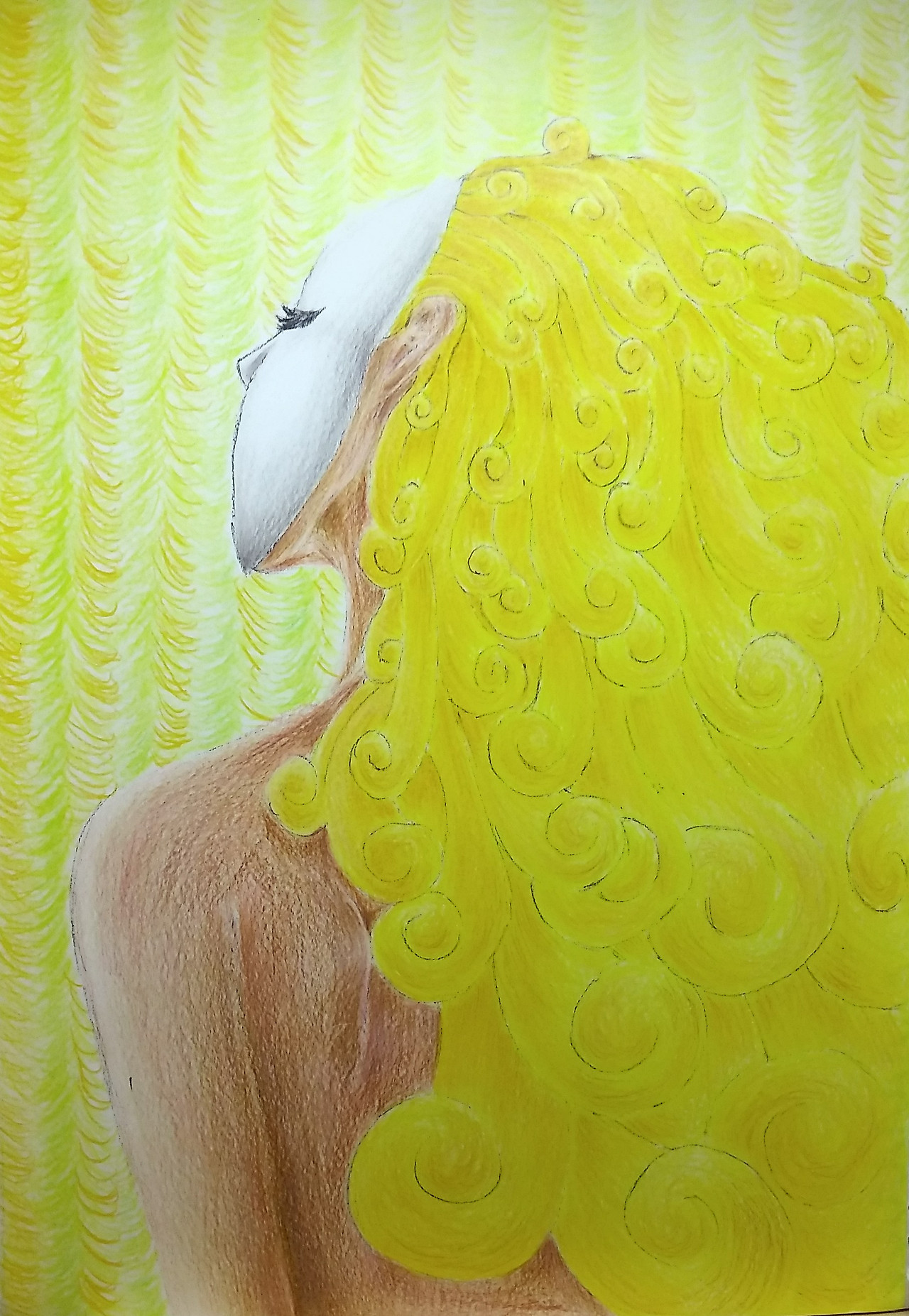 머리색은 왜 노란색일까. 물론 노란색으로만 보일 수도 있지만, 어떤 사람에게는 머리색이 금발로 보일 수도 있다. 두 색이 어떻게 보이는지에 대해서와 의미는 여러분에게 달려있다. 노란색이 지니고 있는 의미는 많기 때문이다. 노란색을 따라가다 보면, 수많은 머리카락들이 표현된 머릿결을 볼 수 있다. 이것의 시작점을 유심히 살펴본다면, 가면으로부터 시작된 것인지, 두피에서부터 시작된 것인지 애매모호하게 표현되어 있다. 만약 가면으로부터 나온 것은 수많은 감정들을 뜻한다. 두피에서 시작된 것으로 본다면, 수많은 생각들과 상상을 의미한다. 그렇다면 머릿결 끝은 왜 동그랗게 말렸을까. 어린아이들이 보았을 때에는 파마를 해서라고 대답할 수도 있다. 이 사람이 심란해서 분위기 전환을 위해 했을 수도 있다고 볼 수 있다. 머릿결이 끝으로 말린 것은 수많은 감정들과 생각들 그리고 상상들을 펼쳐왔다가 시간이 흐를수록 접고 있는 것이다. 세월이 흘러 더 이상 '어린아이'가 아니기에 감정과 생각 그리고 상상을 감출 수 있어진 것이다. 좀 더 펼치고 싶지만, 이미 그 시간은 지나버린 듯하다.
