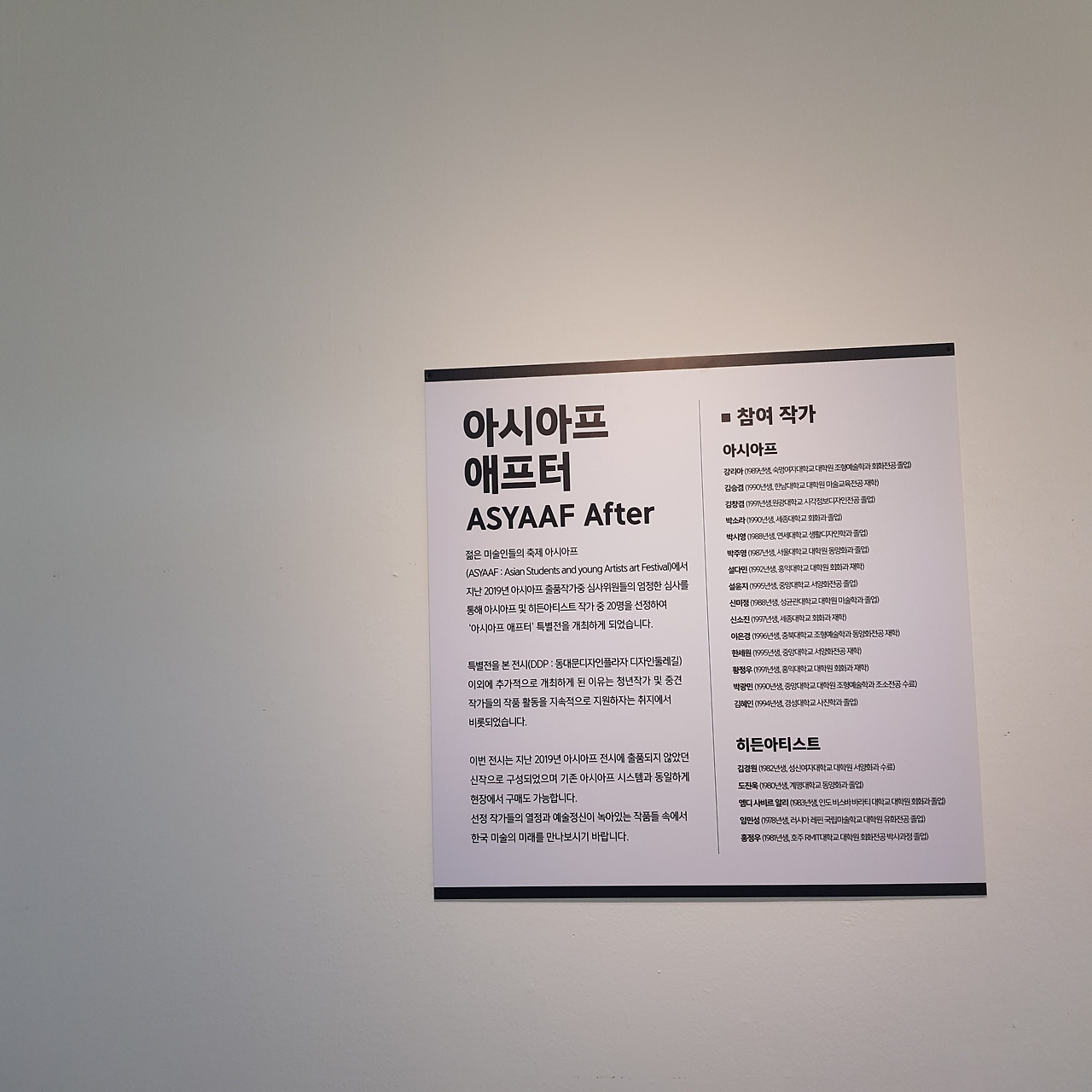그림을 사기 위해 방문한 곳은 '아시아프 애프터'이다. 이 전시회는 신진작가(:경력이 짧은 작가, 가수로 예를 들면 신인가수)의 등용문이라고 불리는 국내 최대 청년 미술축제인 '아시아프'에서 작가를 추린 후 또 열리는 애프터 전시이다. 쉽게 이야기해서, '유망작가를 발굴하는 전시 2nd'로 볼 수 있다.