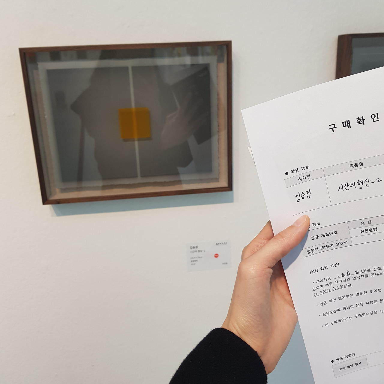 '구매 신청서'에 구매자 정보(성함/생년월일/연락처)를 기재하면 담당자분께서 작품 정보(작가명/작품명/사이즈/작품 가격/구매 일시)를 적어 '구매 확인서'를 주신다. 결제는 다음날 낮 12시까지 해당 계좌에 입금하면 완료다. 그 후에는 작가의 연락을 기다리면 된다.