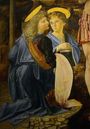 <그리스도의 세례>를 다시 바라보자. 인물들의 근육 표현방법과 그들이 입은 옷의 천 주름, 머릿결과 앞 배경 및 뒷배경을 찬찬히 비교해보니 미묘하게 차이를 보인다.