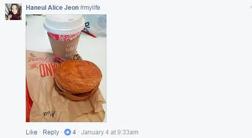 그 순간 마침 나도 아침식사를 하고 있었기 때문에 댓글로 내 아침식사 사진을 달아주었다. 해쉬태그 마이라이프.