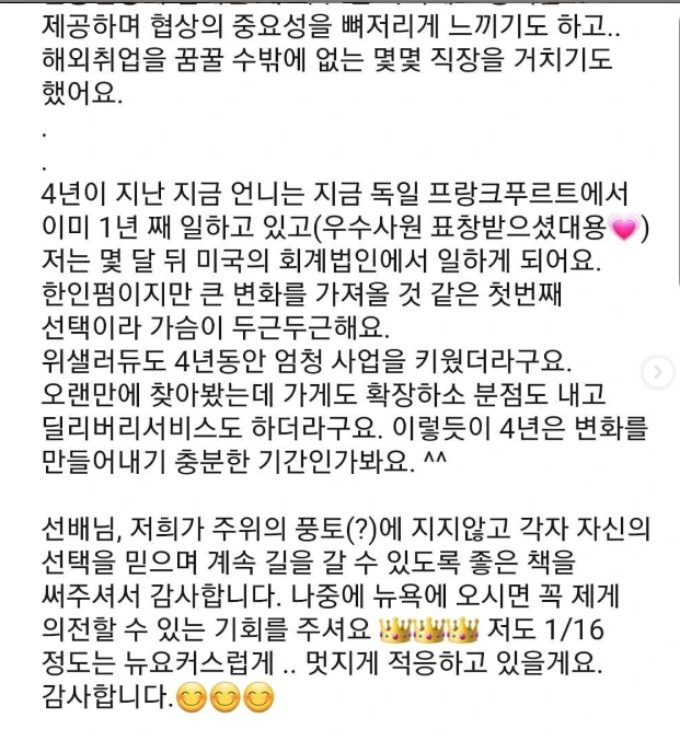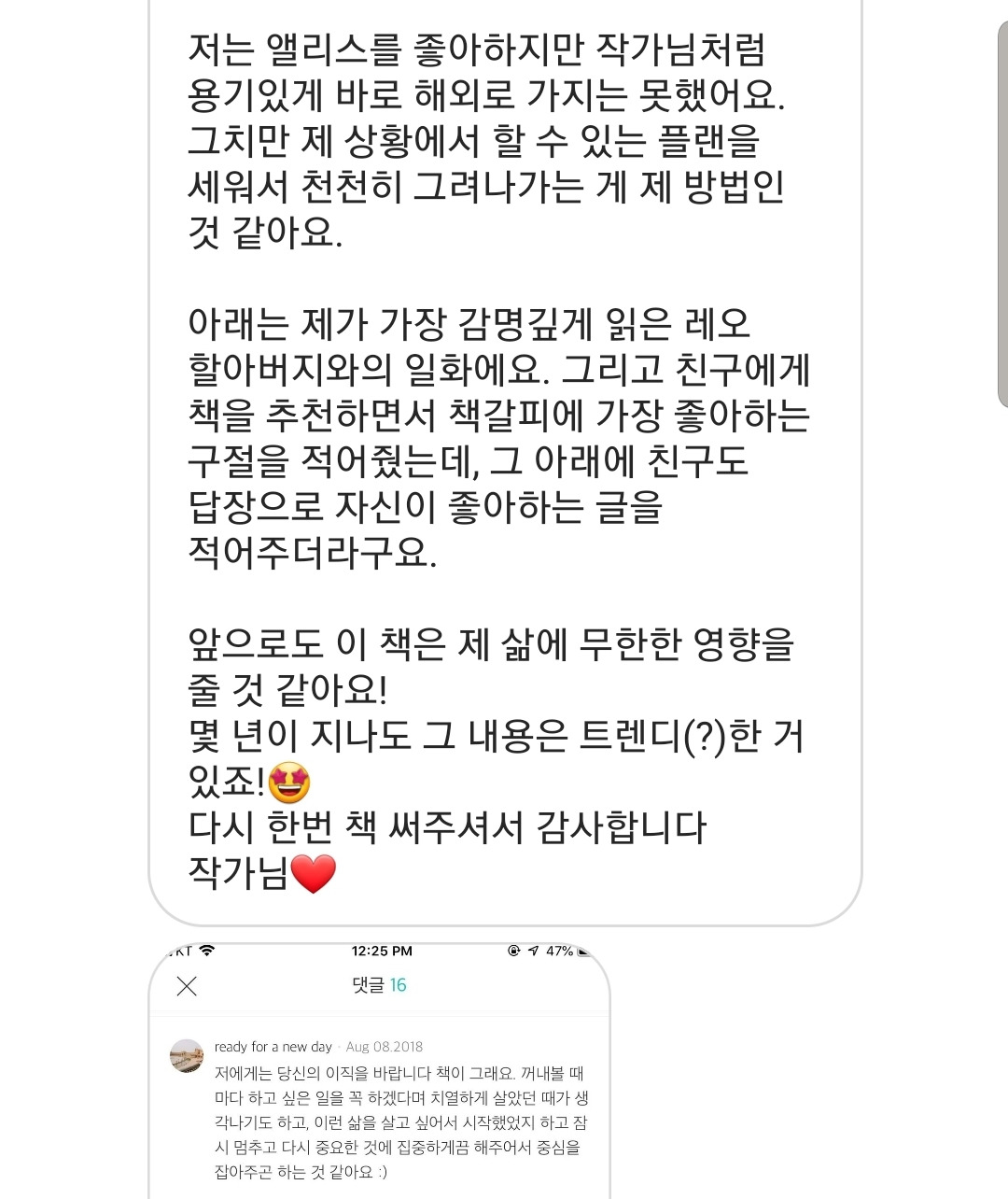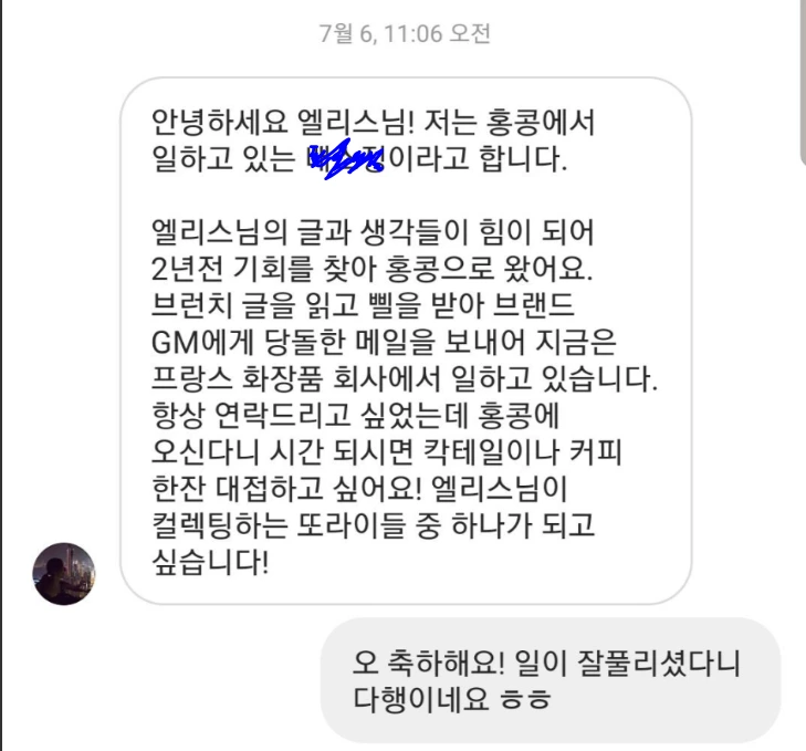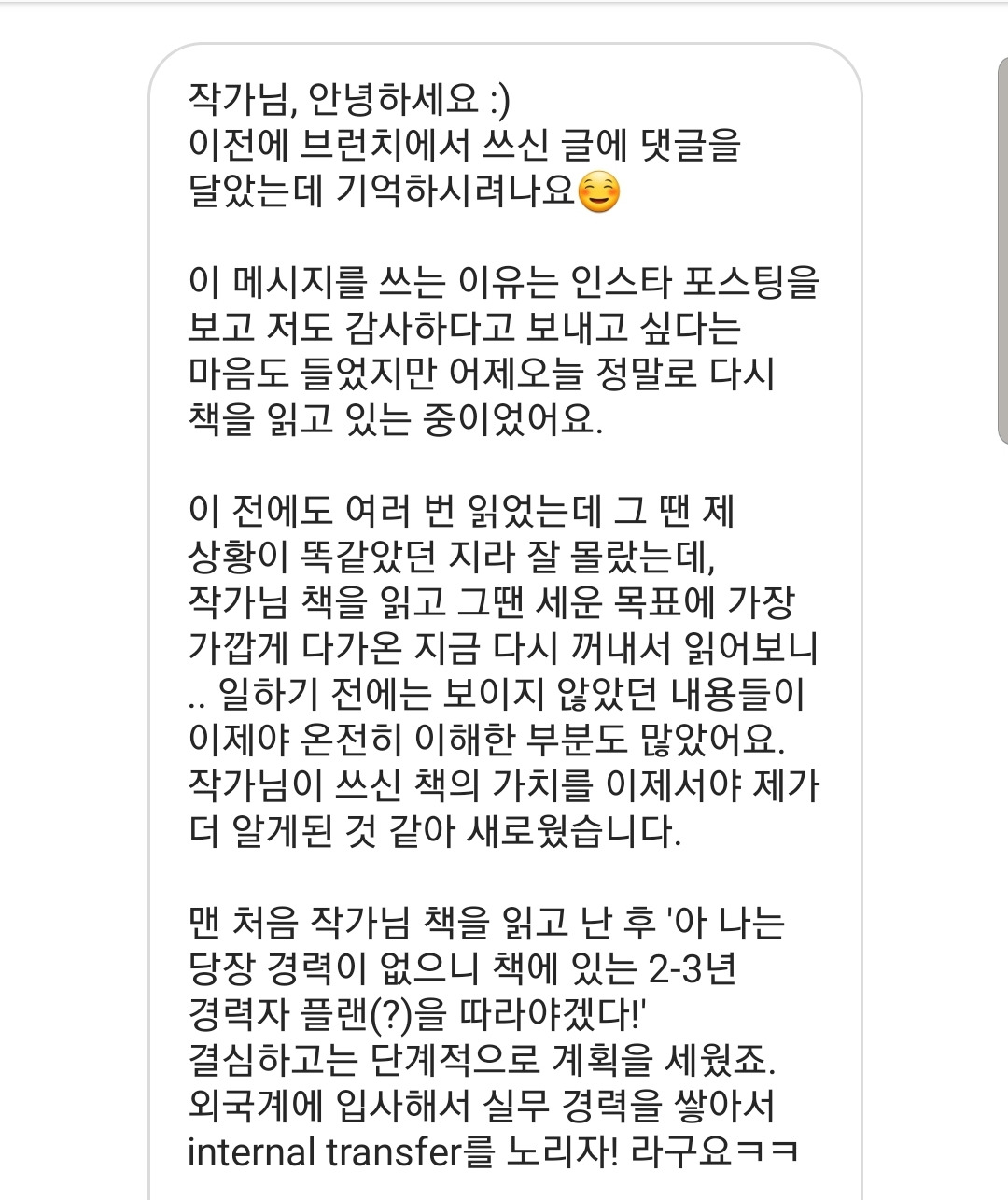 3년이 지나고 난 요새도 이메일이든, 소셜미디어든, 다양한 통로로 사람들에게 감사 인사를 받아요. 이 책을 통해, 제 글을 통해 자신의 삶이 바뀌었다구요. 그런데 제가 글을 쓴고 1년 후의 독자후기보다 3년 후의 독자 후기가 더 좋은건, 이제 단순히 제 책을 재밌게 읽었다는 내용이 아니라, 책을 읽고 영감을 받아 행동으로 옮긴 후 자신의 삶이 어떻게 바뀌었는지를 말해주는 내용이 많았단거에요. 단순 책 내용이 공감되고 좋았다가 아니라, 실제로 행동에 옮겼고 이제 자기도 원하는 삶을 살고 있다는 얘기를 전해오는 사람들이 많아졌거든요. 한사람이라도 삶을 더 나아지게 했다면 의미가 있는데, 제가 따로 받은 연락만 100명 가까이되니까, 적어도 100명의 사람들에게 좋은 영향을 줬기에, 그것은 제가 지금까지 열심히 회사다니며 팔았던 생필품 xx밀리언달러 어치보다 값지게 저에게 남는 것이 되었어요. 제가 담당했던 브랜드는 제가 퇴사하면서 제 손을 떠났지만, 제가 어느 회사에 들어가고 퇴사를 하든 제가 만든 이 이야기들은 저와 함께 남았어요.