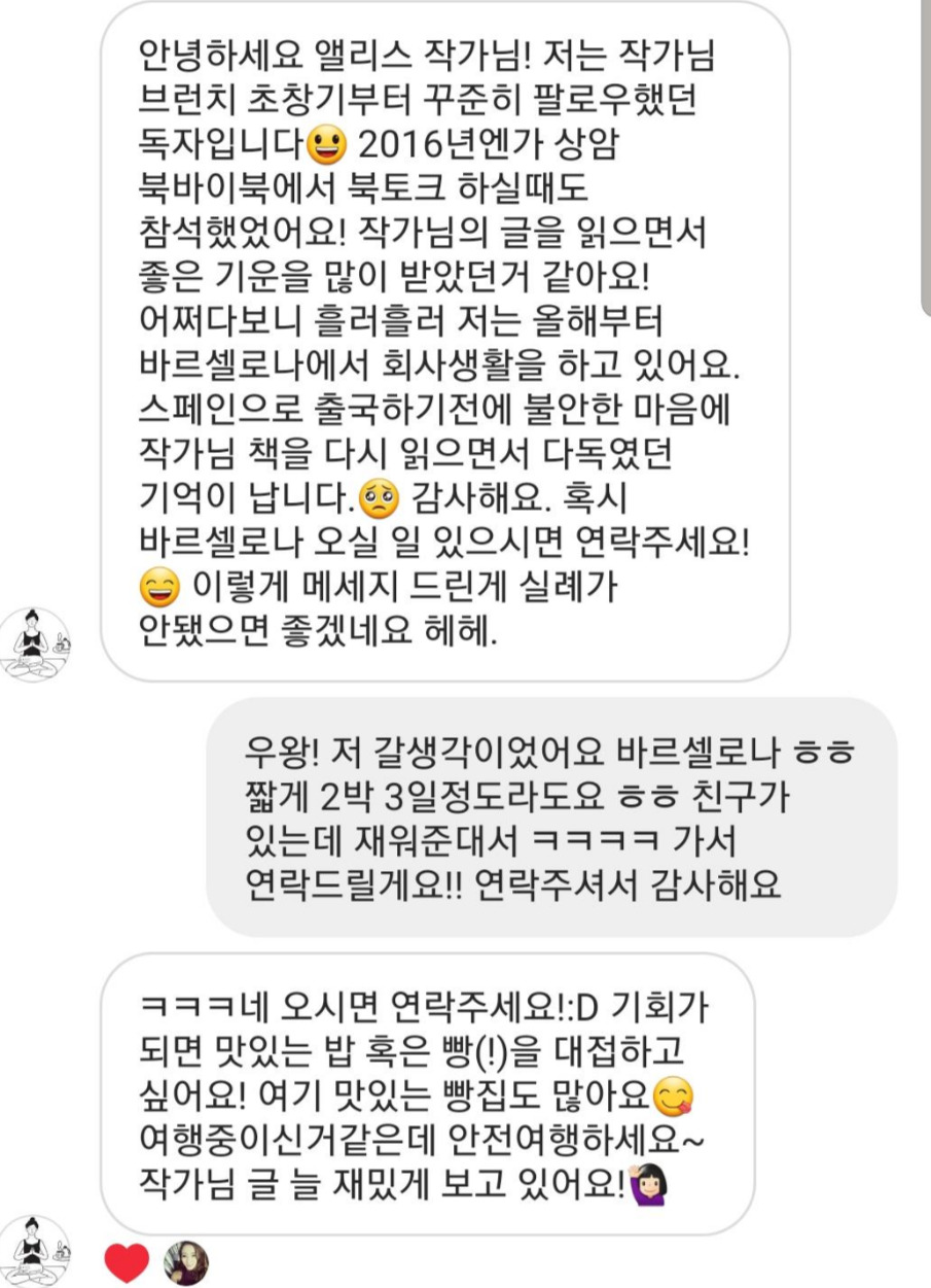 그리고 퇴사 후 요새 아주 신나게 여행을 다니고 있는데, 그때마다 많은 분들이 DM을 줘요. 홍콩에서도, 중국에서도, 리스본에서도, 바르셀로나에서도, 독일에서도, 스웨덴에서도 아직 만나지는 못했지만 저를 알고 있고 공감하고 있는 사람들의 초대를 받는 다는 것은 짜릿한 일이에요. 그리고 이 사람들이 이런 멋진 삶을 사는데 제 이야기가 조금이라도 도움이 되었다는 것도 너무 행복한 일이구요.