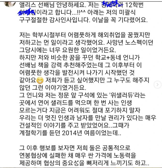 2015년 말, 저는 브런치에 '싱가폴에서 일하는 앨리스'라는 정체성으로 무작정 싱가폴에 와서 직업을 구하고 일하는 과정에서 생긴 에피소드들을 브런치에 쓰기 시작했어요. 아직 브런치 작가들이 많지 않을 때라, 브런치 팀에서 자주 포털에 제 글을 노출시켜주신 덕분에 금방 구독자가 늘었고, 독자분들과 소통하는 재미로 일주일에 한번씩은 꼭 글을 썼던 기억이 납니다. 그렇게 *나름* 인기작가도 되고, 운 좋게도 중앙북스와 인연이 닿아 2차 브런치 작가 대상을 수상을 하여 '당신의 이직을 바랍니다'라는 책도 출간을 하게 되었어요. 출간을 했던 시점이 2017년이었으니 저는 운이 좋게 브런치에 연재를 한지 1년만에 인세를 받을 수 있는 작가가 될 기회를 얻었던 것입니다. 브런치에 처음 글을 쓸때만 해도 이런 건 생각지도 않았는데 말이에요.