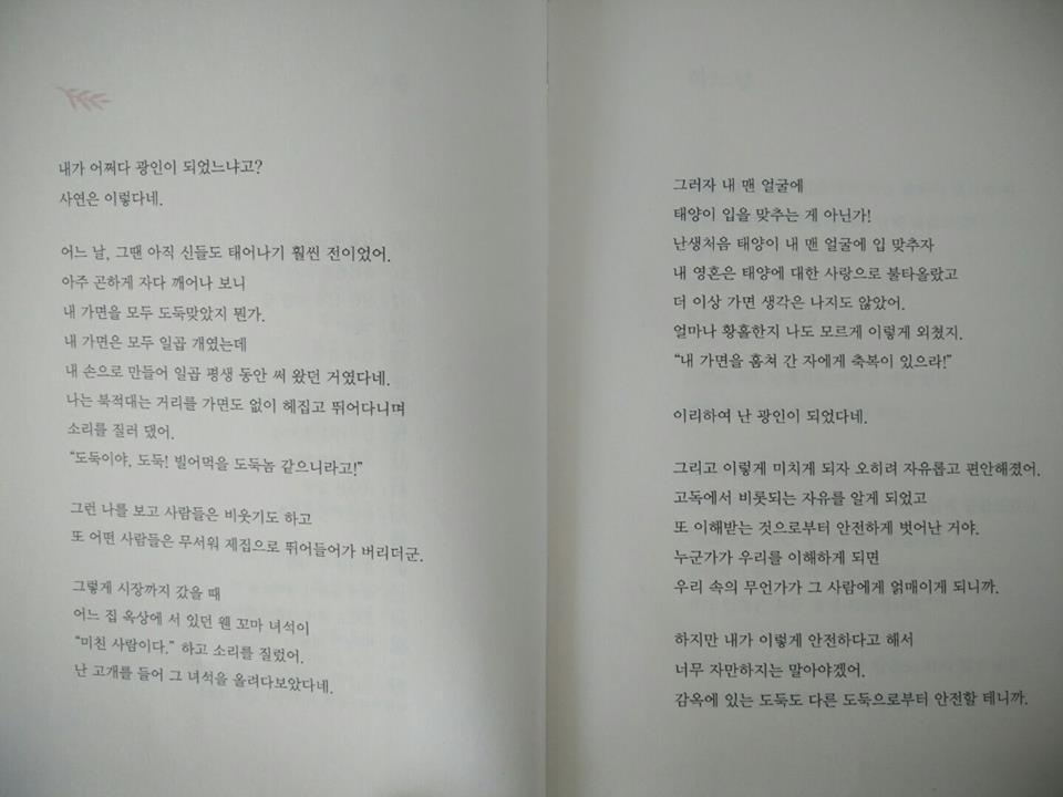 언니는 나에게 많은 책들을 주었는데, 언니가 준 모든 책들은 다 나와 싱가폴에 있다. 그 중 언니가 준 첫번째 책은 칼릴 지브란의 광인이라는 시집이다.