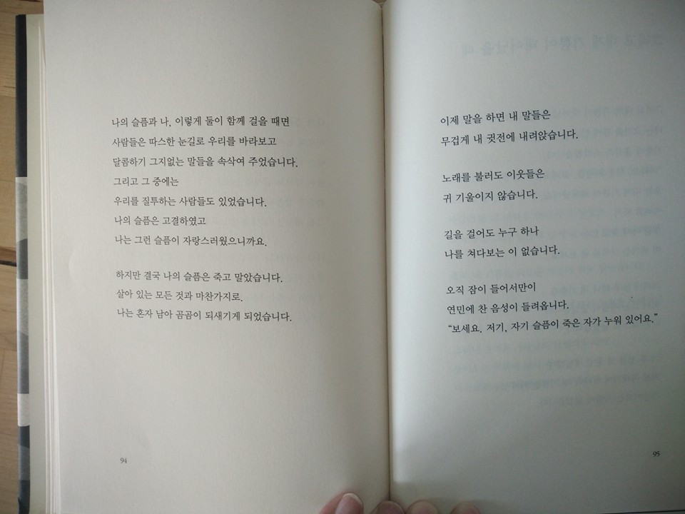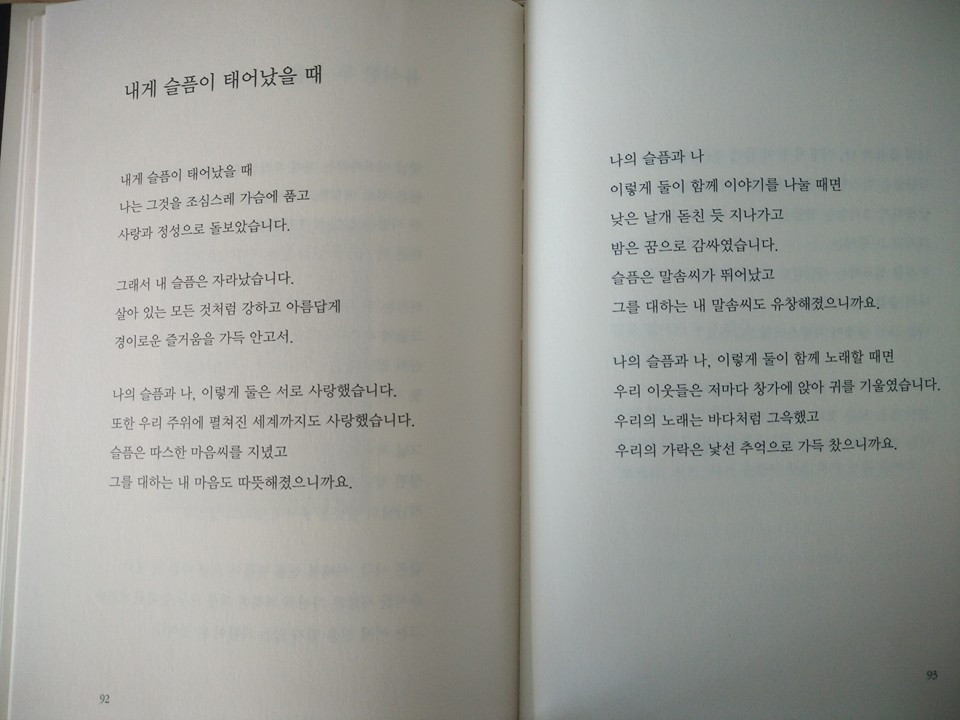 마지막 두개의 시는 기쁨과 슬픔에 관한것인데 재미있다고 생각했다. 기쁨과 슬픔중 뭐가 더 좋고 나쁜것은 없다. 때로 슬픔에 중독된 사람들도 많이 보니까... 그리고 슬픔이 주는 평안은 분명있다. 그런데 기쁨과 슬픔에 대한 사람들의 반응은 재밌다. 슬픔에게는 사람들이 많은 위로를 건네고 관심을 보이지만 기쁨에게는 무관심하다.