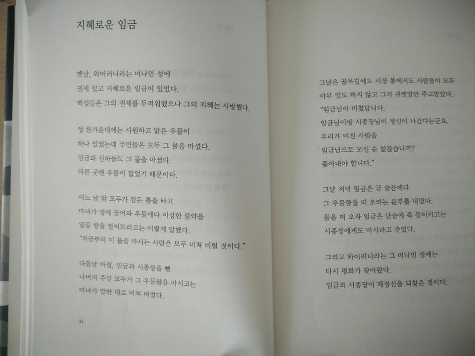 하지만 두번째 시인 지혜로운 임금에서 보이는 것처럼 모두가 미쳐있는 곳에서 혼자 제정신으로 나의 길을 가기란 쉬운일이 아니다. 그리고 한국이란 환경은 다수의 의견/집단의 관점이 워낙 강력하게 작용하는 문화라서 마이웨이를 가기 더 어려운 부분이 분명히 있다. 특히 한국에서 교육을 받았다면 부모님의 사랑, 선생님의 애정, 아이들의 부러움은 시험결과, 어떤 대학을 가느냐에 있었고, 그것이 사회를 나오면 그대로 돈, 어떤 회사를 가느냐로 바뀌니까, 즉 '다른 사람들의 선망을 얼마나 받느냐'가 나의 존재의 가치처럼 생각하도록 강요받는데에 익숙할테니까 말이다. 그런 곳에서는 그냥 다같이 미치는 편이 분명 올바르지는 않지만 안전한 선택이기도 하다. 그래서 많은 젊은이들이 한국을 떠나려고 하는 것 같다는 생각이 든다. 아무리 내가 제 정신을 차리려고 해도 그러기 어려운 환경에 있다는 마음이 분명 들테니까.