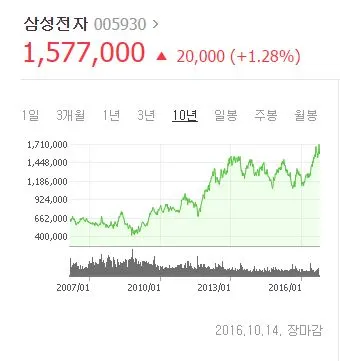 오늘 네이버에서 캡쳐한 삼성전자의 지난 10년의