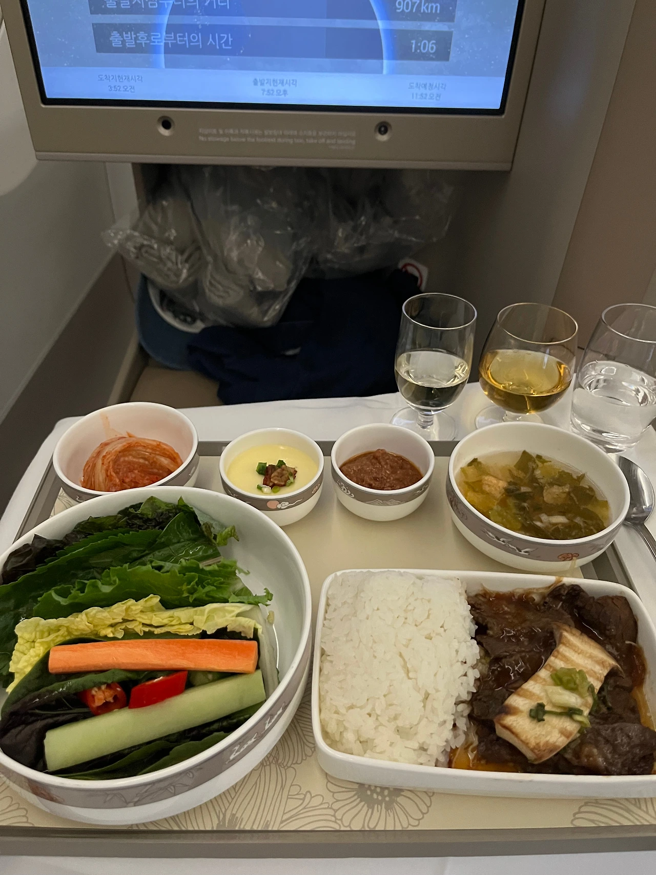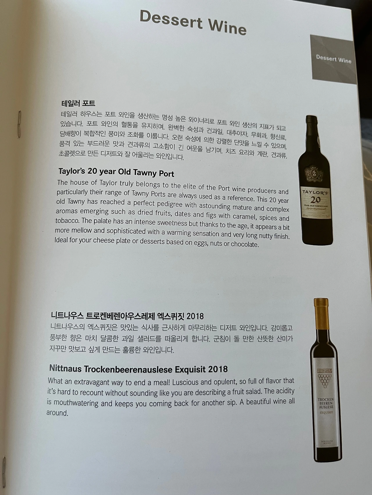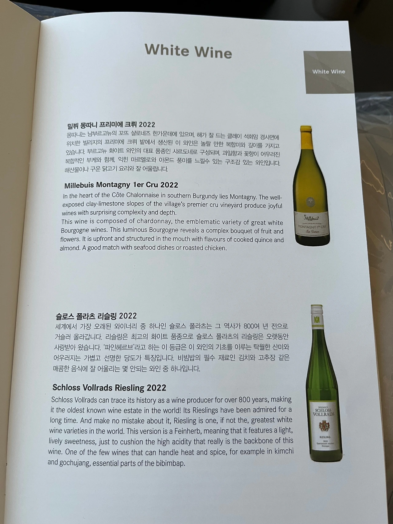일단, 탑승 직후 웰컴드링크로 제공되고 있었으나 지각 탑승이라는 과오를 저지른 민망함에 내 스스로 거절했던 팔머 브뤼 리저브Palmer Brut Reserve 샴페인 한 잔, 식사로 선택한 양념갈비에 어울릴만한 한산소곡주(아마도 우희열 명인의 것) 한 잔, 뜯다 보니 갈비도 고기인지라 자연스레 지공다스Clos du Bois de Menge Gigondas 레드와인 한 잔, 후식으로 제공된 떡에 곁들일 테일러 타우니 포트Taylor's 20 year Old Tawny Port 한 잔과 과일에 어울릴 트로켄 베렌 아우슬레제 리슬링Nittnaus Trockenbeerenauslese Exquisit 한 잔.