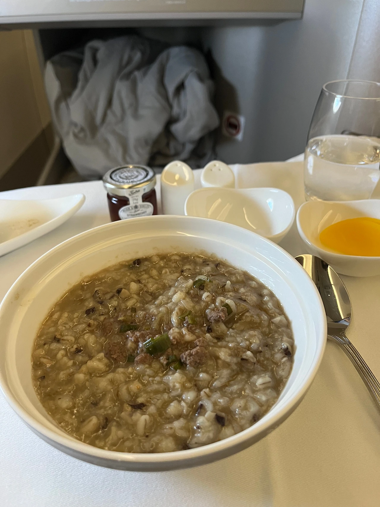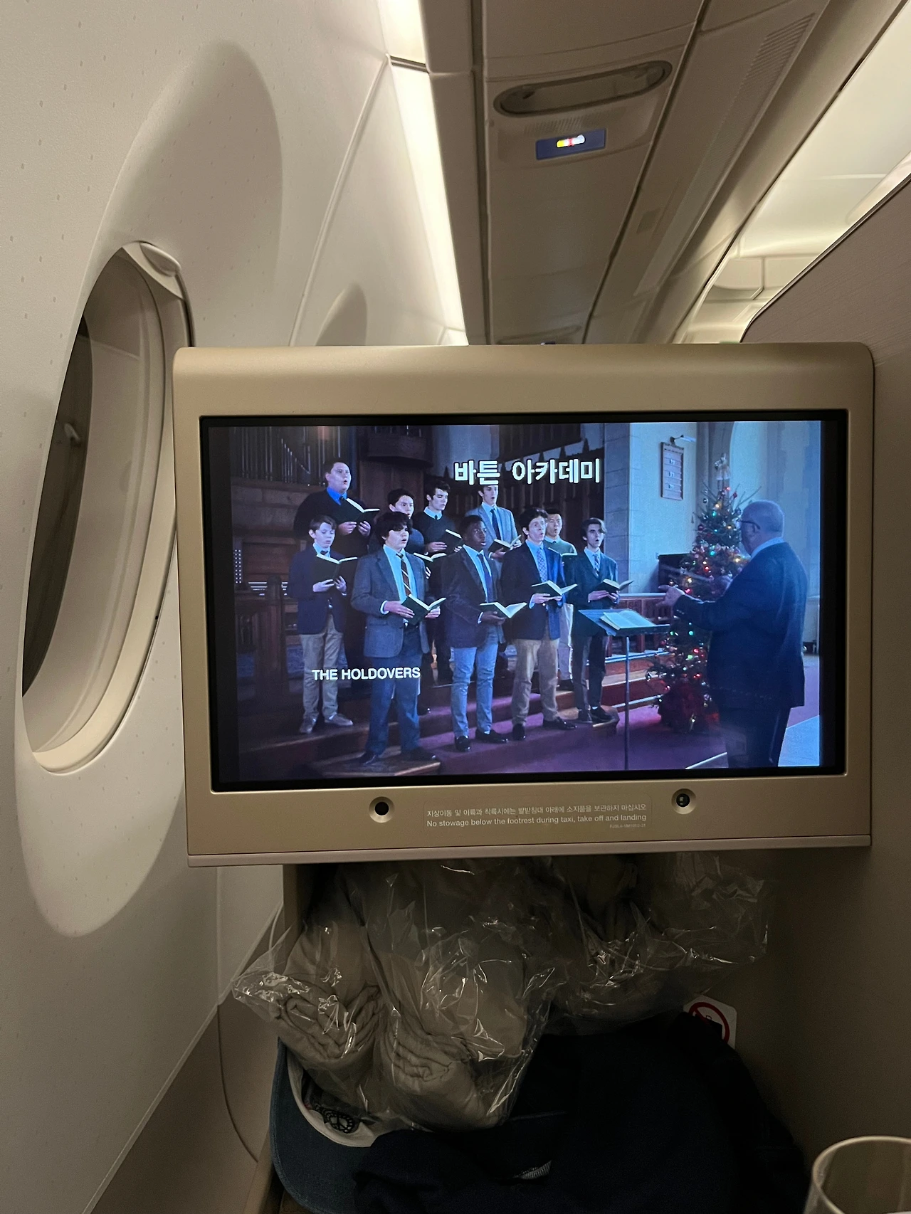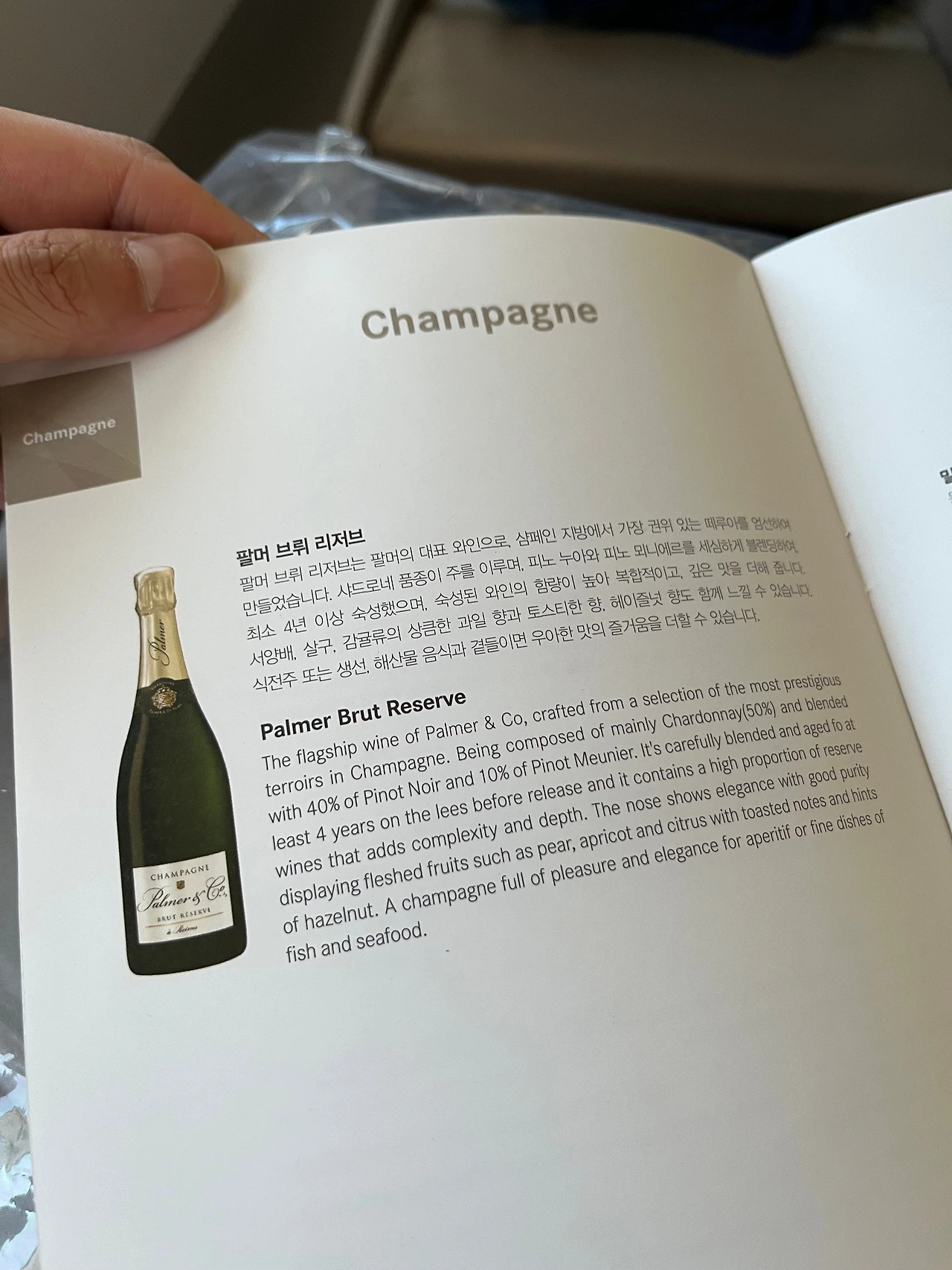일단, 탑승 직후 웰컴드링크로 제공되고 있었으나 지각 탑승이라는 과오를 저지른 민망함에 내 스스로 거절했던 팔머 브뤼 리저브Palmer Brut Reserve 샴페인 한 잔, 식사로 선택한 양념갈비에 어울릴만한 한산소곡주(아마도 우희열 명인의 것) 한 잔, 뜯다 보니 갈비도 고기인지라 자연스레 지공다스Clos du Bois de Menge Gigondas 레드와인 한 잔, 후식으로 제공된 떡에 곁들일 테일러 타우니 포트Taylor's 20 year Old Tawny Port 한 잔과 과일에 어울릴 트로켄 베렌 아우슬레제 리슬링Nittnaus Trockenbeerenauslese Exquisit 한 잔.