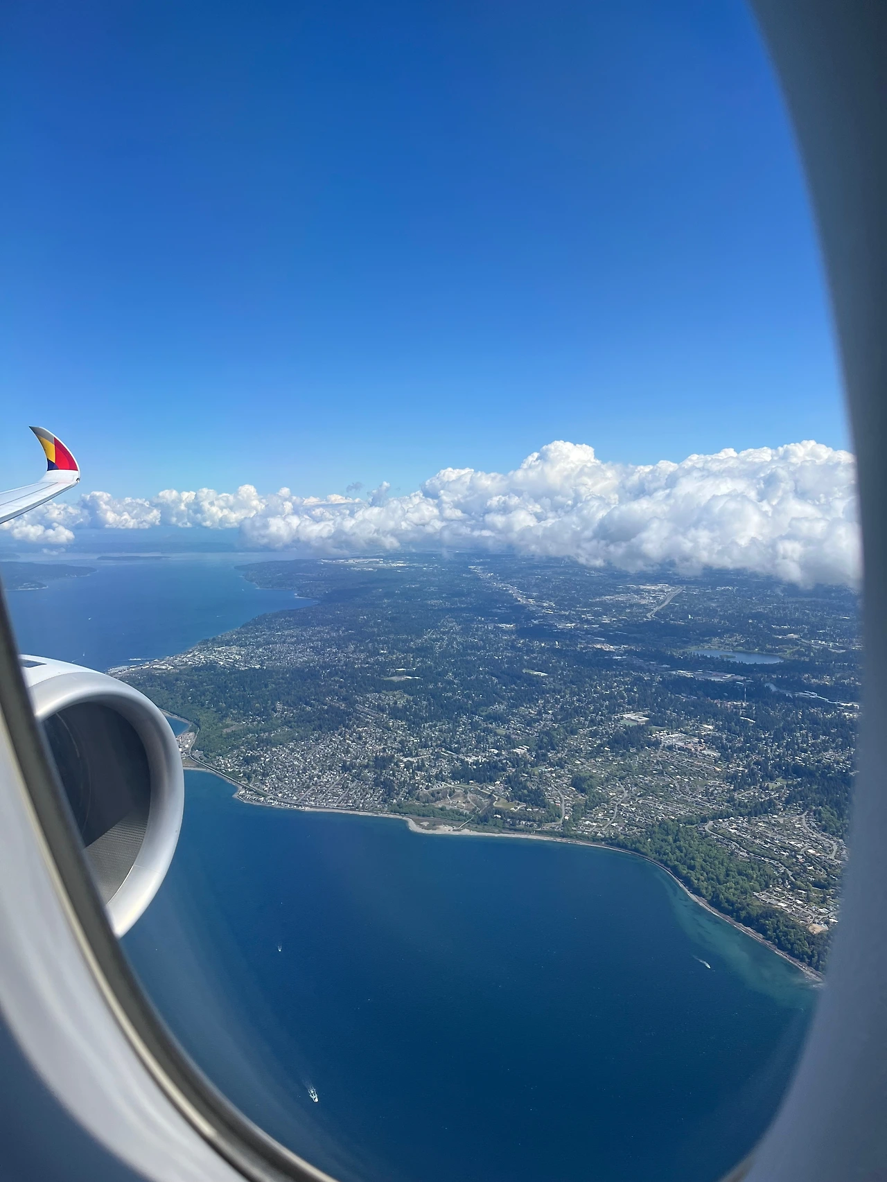 3시간쯤 잤으려나, 두 번째 식사 준비를 위해 분주해진 승무원들의 움직임에 잠에서 깨어났다. 내가 선택한 두 번째 식사 역시 한식, 쇠고기죽. 오래오래 미국 음식을 접할 것에 대비하는 마음으로 두 번의 기내식을 모두 한식으로 선택했다, 아메리카 대륙에 발을 내딛기 전까지 한국인 정신을 완충시켜 두겠다는 마음과 함께. 기대와 달리 죽은 시큼 텁텁한 것이 영 맛이 없었지만, 소금과 후추의 덕을 보면서 나는 어떻게든 코리안 쏘울을 충전하고 있었다(앞으로 아시아나항공에서 쇠고기죽은 선택하지 않기로 해). 최후의 한식을 해치우는 동안, 창밖으로 새하얗게 밝은 빛이 새어 들어오고 있었다. 한국 시간으로 새벽 3시를 넘긴 시간, 하지만 가까워진 서부 미국의 시간으로 오후 12시를 향해가는 시간. 창문을 열자 눈이 너무 부셔 차마 밖을 제대로 쳐다볼 수 없을 정도였다. 밤의 시간을 그다지 누리지 못했는데 순식간에 아침 해가 밝은 느낌이랄까. 갑작스러운 푸른 하늘과 뭉게뭉게 피어난 하이얀 구름, 짙푸른 바다와 밝은 초록빛의 나무로 덮인 섬과 육지, 그것이 바로 2024년 5월 1일의 워싱턴주였다.