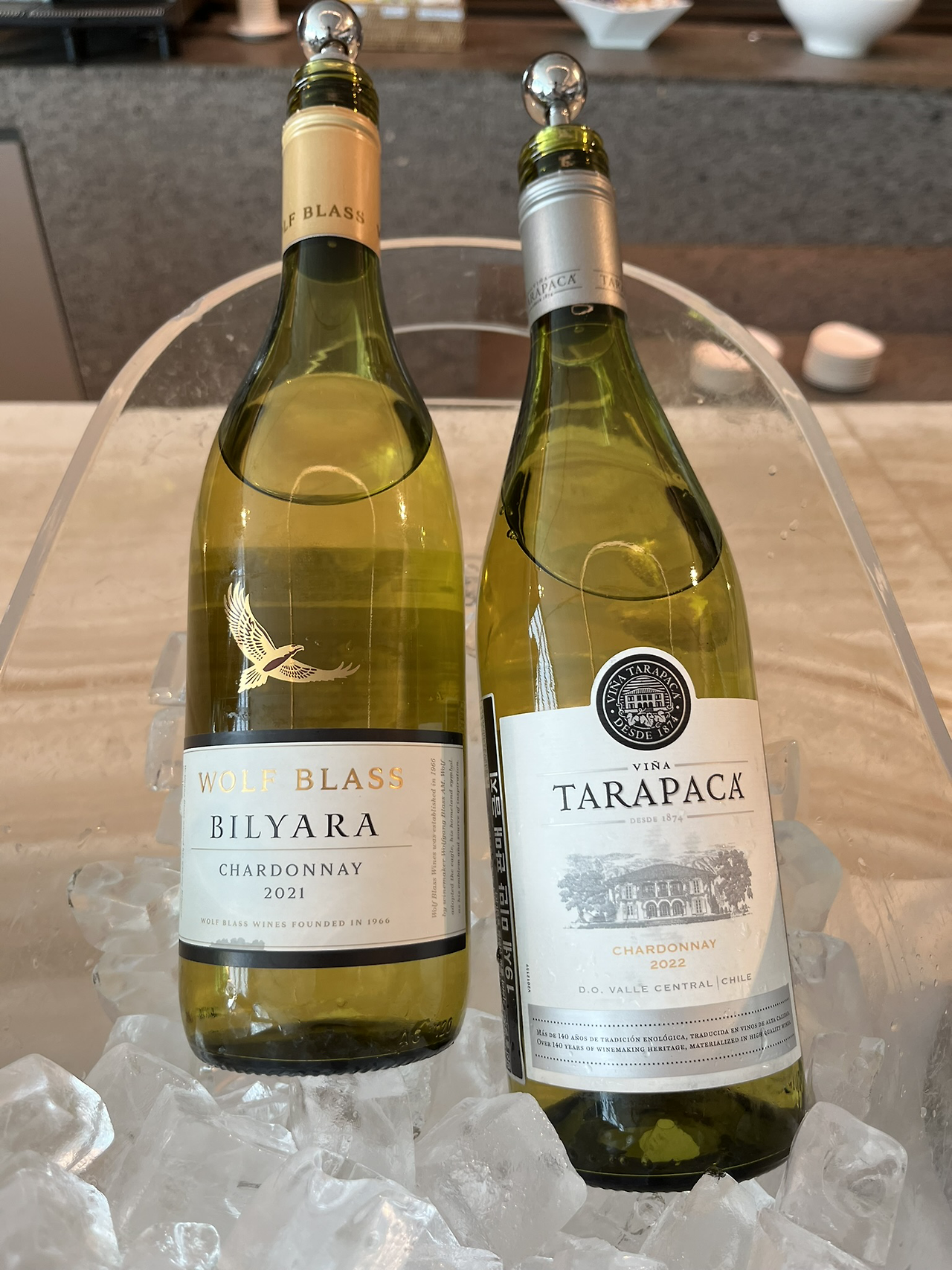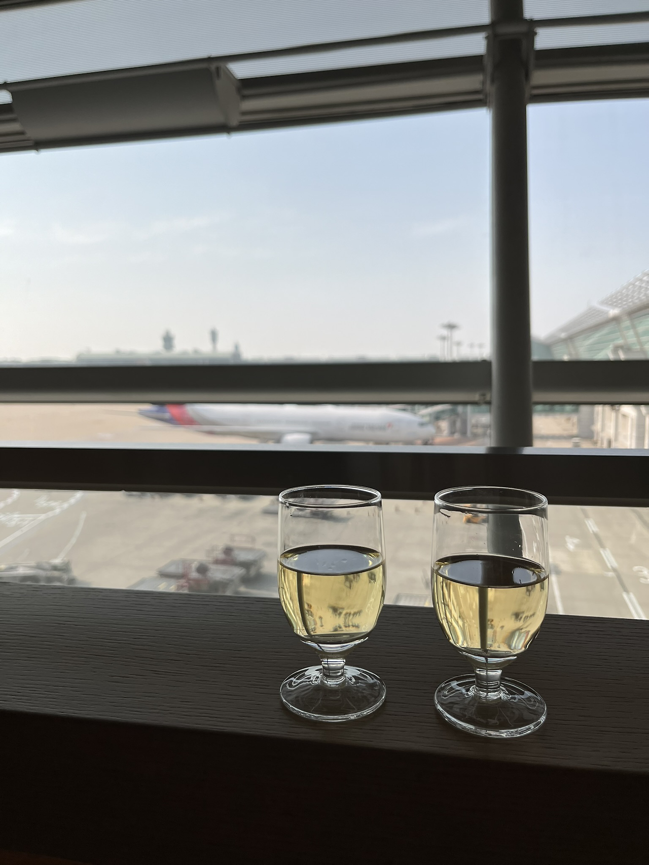 현재시각 16:32. 간단한 샐러드 요깃거리를 챙겨다 자리를 잡은 뒤, 여행을 떠나는 늦은 봄의 끄트머리에서 시원하게 나의 구미를 당겨줄 화이트 와인 2종을 택한다. 호주의 울프 블라스 빌야라 샤르도네 2021과 칠레의 타라파카 샤르도네 2022. 마침 또 비교시음하기 좋게 동일한 샤르도네 품종에 유사한 빈티지(수확연도)를 멀찌감치 떨어진 두 나라의 것으로 준비해 주셨다. 나의 샐러드와 어울리는 단 하나의 샤르도네는 둘 중 과연 무엇일까? 정차된 비행기들을 배경으로 호주 샤르도네 한 모금, 약한 잔당감으로 인해 살짝 달큰한 것이 미네랄워터처럼 음용하기에 편안함을 선사한다. 향긋한 시트러스와 핵과류 위주의 샤르도네 향은 덤. 이번엔 칠레 샤르도네 한 모금, 진한 풀내음과 함께 조금 더 드라이하고 쌉싸름한 것이 ‘오늘 낮 식사 짝꿍은 나야 나!’를 외치고 있다. 사실 둘 다 나쁘지 않은 와인이라 모두 맛있게 비워냈지만, 나의 샐러드와 나의 입맛과 조금 더 맞았던 것은 호주의 샤르도네였던 것 같다.