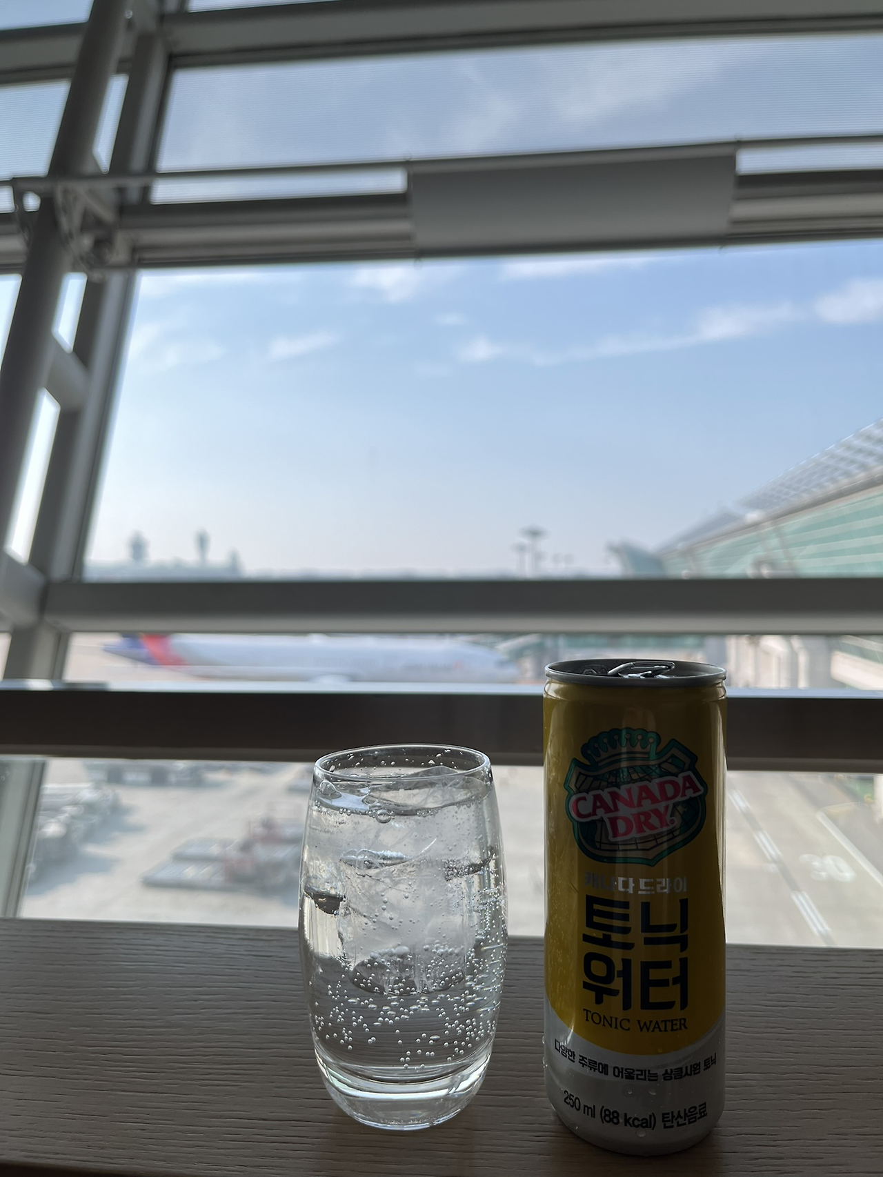 현재시각 17:14. 화이트 와인과 샐러드 페어링을 마치고 나니, 조금 더 본격적인 식사가 떠올랐지만 비행기를 타자마자 기내식을 내어줄 테니 그것은 참기로 한다. 그렇다면 지금 이 입안을 한 번 정리해 줄 술이 무엇이 좋을까? 아무래도 주니퍼베리, 두송실이라고도 불리우는 노간주나무 열매의 화사한 향이 가득한 증류주 진이 좋겠다. 탱커레이라는 준수한 진과 토닉워터가 준비돼 있으니 진 앤 토닉을 말아보기로 한다. 47.3%의 알코올 도수를 자랑하는 탱커레이와 토닉워터를 1:3의 비율로 섞어주면 좋을 듯한데, 아무래도 지거(측량용 잔) 없이 눈대중으로 섞으려니 쉽지가 않아 결국 술이 많이 들어가 버렸다. 하지만 그것은 나 같은 주당들에겐 일종의 개이득(?)이 아니겠는가. 캐나다드라이의 토닉워터는 그다지 달지 않아 향긋하고 드라이한 진 앤 토닉에 비행기 한 대, 두 대 날아가는 것을 구경하다 슬슬 취기가 기분 좋게 오르고 만다.