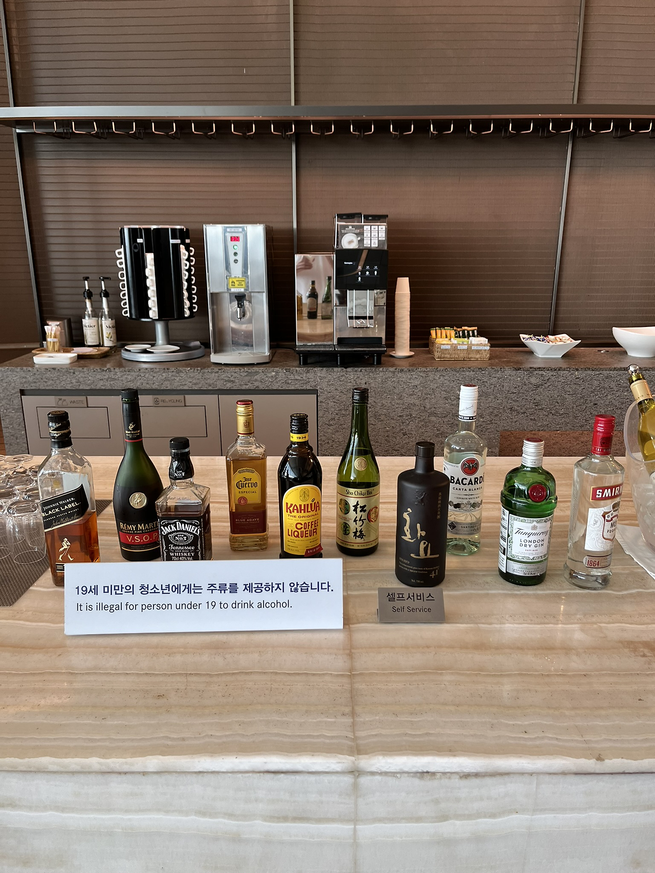 무탈히 출국 수속까지 마치고 간단히 주문해 둔 면세품 몇 가지를 인도받은 뒤, 내가 가야 할 곳은 오직 그곳, 다채로운 공짜술과 공짜안주를 흡입할 수 있는 라운지뿐이다. 오랜만에 다시 찾은 아시아나 비즈니스 라운지, 1년 반 전에 엄마를 모시고 태국 방콕으로 효도여행을 다녀온 뒤로 처음이다. 이렇게 기억을 더듬어 보니 오랜만에 비즈니스를 타는 내가 어설플 만도 하다. 그 1년 반이라는 시간 동안 쌓아온 나의 알코올 내공은 증류주에 조금 더 특화되어 있었으니, 두근거리는 마음과 함께 들어서자마자 빠부터 찾아가 라인업을 살펴본다.