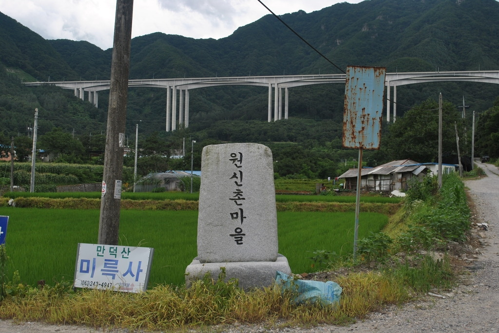 곰티재 옛길은 완주군 소양면 신촌리를 지나 산비탈을 올라간다. 마을 입구에 세워진 원신촌 마을 표지석 뒤 공중에 익산-포항 고속도로가 걸려있다.