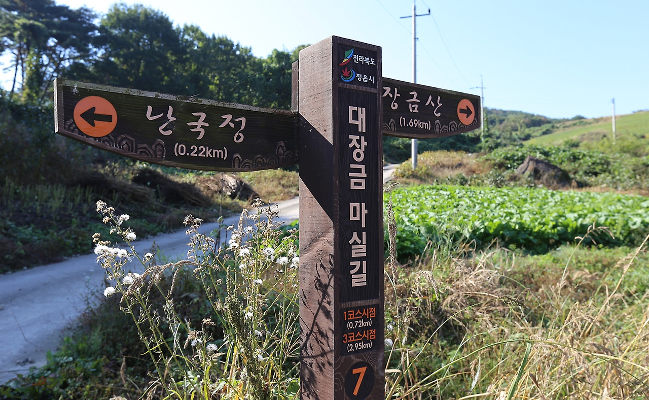 난국정에서 장금산 쪽으로 가다 보면 대장금 약수터가 나그네를 반겨준다. 황토마을을 지나는 길은 포장도로여서 난국정 부근까지 차가 들어갈 수 있고, 안내판이 곳곳에 잘 만들어져 있어 처음 걷는 이들도 쉽게 길을 찾을 수 있다. 길이 잘 정비돼 걷기 편하며 시원한 우거진 숲 속 길에서 삼림욕을 즐기듯 산책할 수 있다. 걷는 길마다 정읍의 명물인 단풍나무도 볼 수 있고, 들꽃들이 피어나면 향기롭기까지 하다.