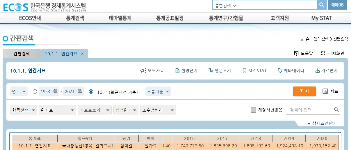 ECOS 메인화면 좌측의 '국민계정' 란에서 들어갈 수 있다