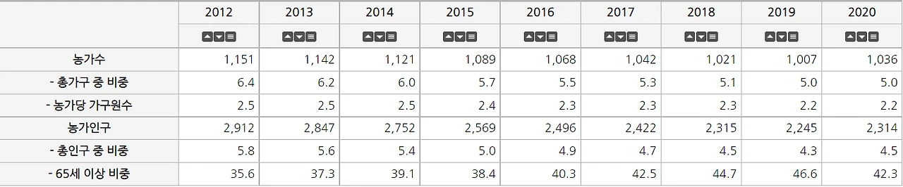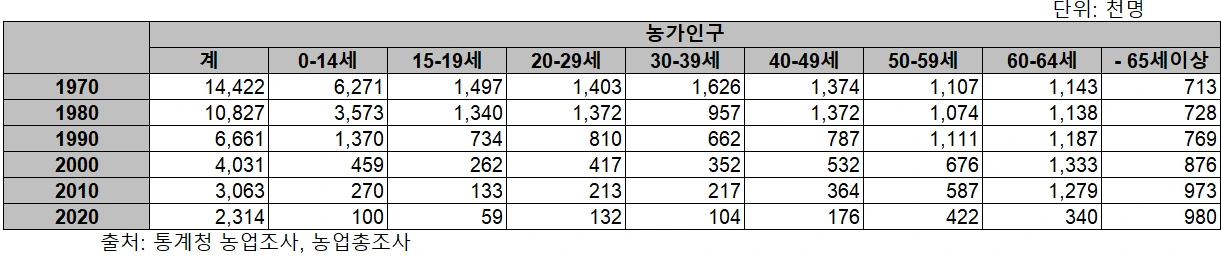 - 농가인구 : 농가에서 생계를 같이하는 가족 및 친인척. 혈연관계가 없어도 농업과 관련되면 가구원에 포함함
