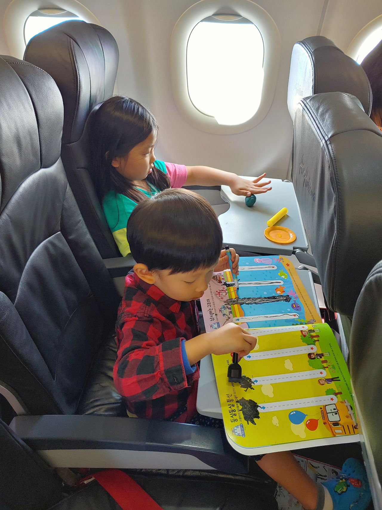 둘째가 잠에서 깰 때쯤, 큰아이는 공부를 마무리하고 미리 준비했던 애니메이션을 보기 시작했다. 그리고 두 시간을 넘게 잔 둘째는 남들보다 늦은 식사를 시작했다. 아이스크림까지 먹이고 나자, 목적지까지는 두 시간 정도밖에 남지 않게 되었다. 둘째가 식사를 마치자 아내의 가방에서는 그리기 놀이 책이 나왔다. 둘째는 놀이 책만 가지고 거의 한 시간을 놀았다. 큰아이가 영화 관람을 마치고 나자, 아이들은 엄마의 가방에서 나온 클레이로 만들기 놀이를 시작했다. 큰아이는 다양한 먹을거리를, 둘째는 행성을 만들기 시작했는데, 큰아이의 칼국수가 상당히 먹음직스럽게 만들어졌고, 작은 아이의 토성 고리가 그럴듯하게 붙어 있어서 우리는 아이들을 아낌없이 칭찬할 수 있었다.