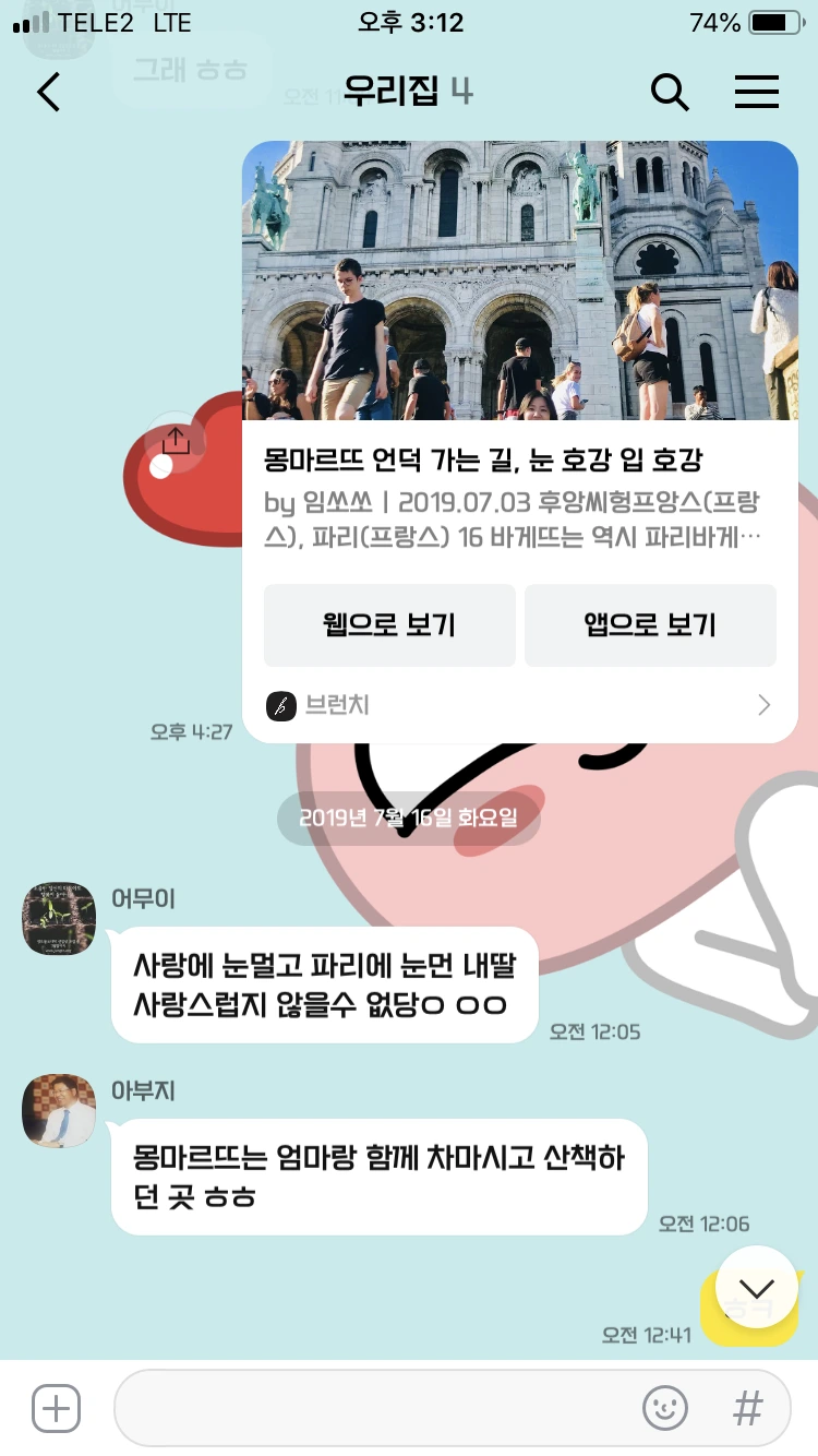 여행 오기 전에 후원의 대가로 여행에서 얻는 걸 함께 나누기로 약속했다. 그래서 에세이를 매일매일 가족 카톡방에 공유했다. 엄마는 마드리드 편에 나오는 '하얀 얼굴과 동그란 눈도 그대로였다.'는 표현이 마음에 드신단다.