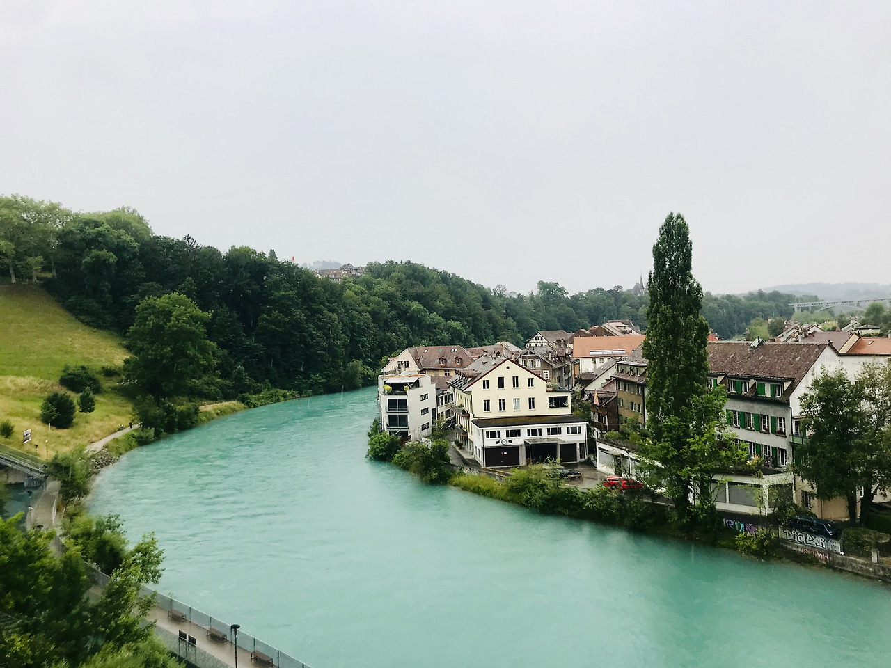 주변과 참 잘 어울리는 목조 지붕의 낮은 건물들과 곳곳에 뾰족뾰족 튀어나온 성당들이 가득한 베른, 그 베른을 섬처럼 안고 있는 아레강이 날씨 덕에 약간 신비로운 느낌으로 아른아른거린다. 이건 완전 동화다. 도시가 이렇게 단아할 수 있나. 무려 이 예쁜 도시가 정신없이 바쁠 한 국가의 수도라는게 더 충격. 단아한 그 도시는 그 강과 나무들이랑 세트로 태어난 것 같다. 안정적이다. 사람이 사는 곳이 이렇게 예쁠 수 있구나. 너무 예뻐서 내려가기 아쉽다.
