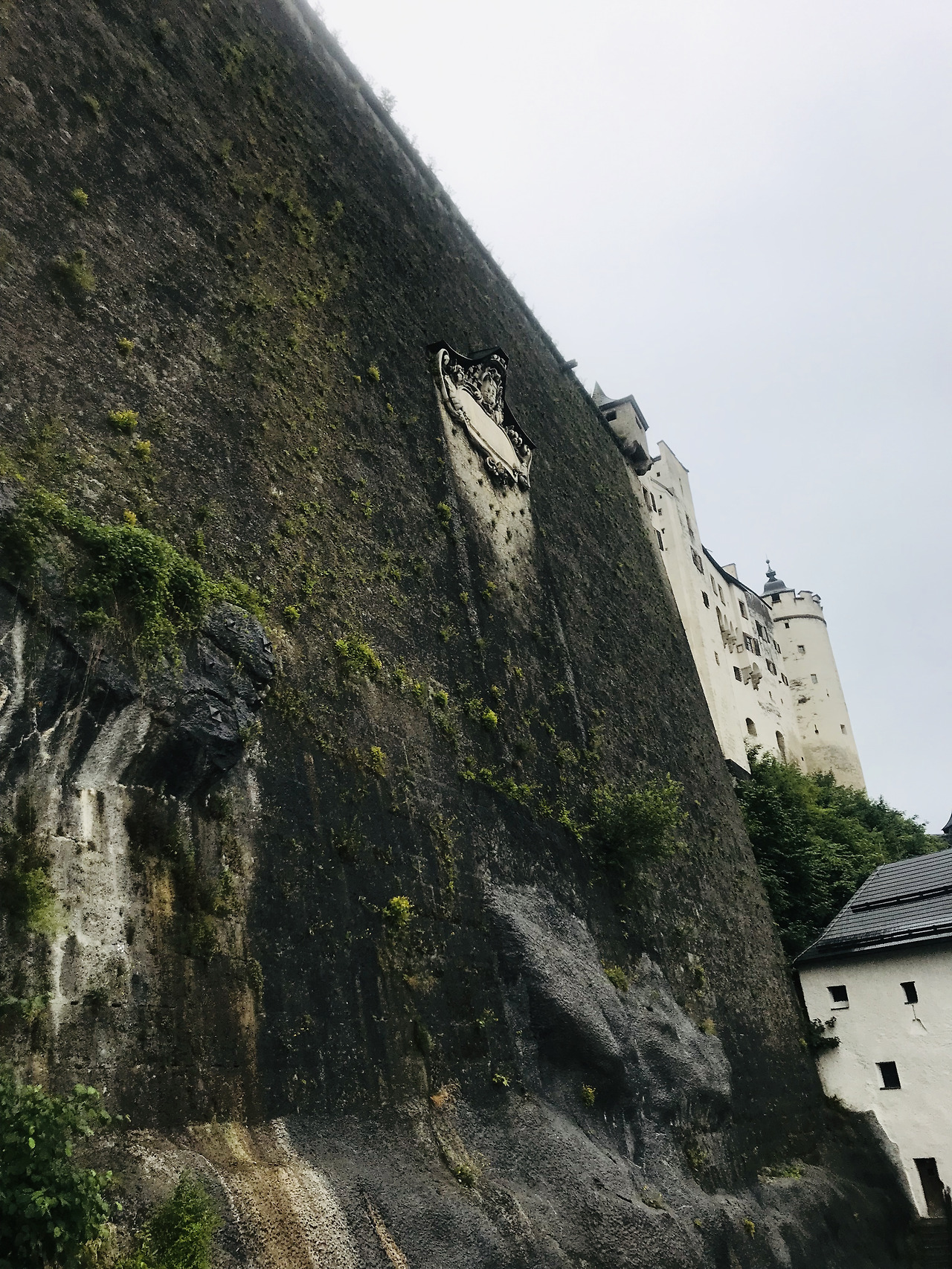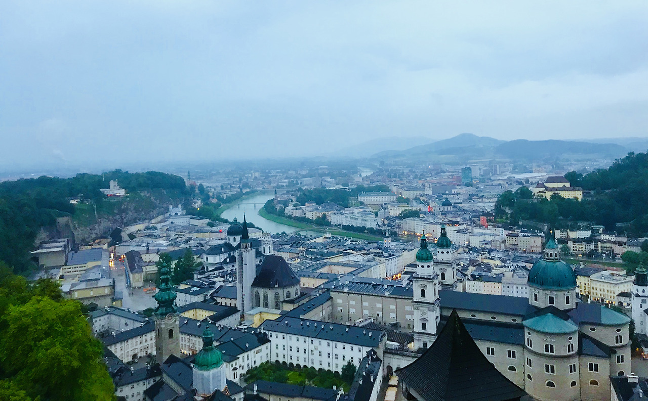 빵과 복숭아 포션으로 피를 채우고 다시 3탄 호엔잘츠부르크성 전망대에 도전한다. 아, 오길 잘했다. 예쁘다. 잘츠부르크 시내가 한눈에 들어온다. 비 내리는 마을도 예쁘네. 흑백사진이 예쁜 것처럼 차분한 느낌. 이 오들오들한 떨림은 잘츠부르크 전망에서 오는 전율이 아니라 전신의 핏줄에서 오는 미열 때문이겠지. 그래서 이 전망이 더 감동적이다. 그리고 난 지금부터 정류장까지 1시간 반을 더 걸어야 한다.