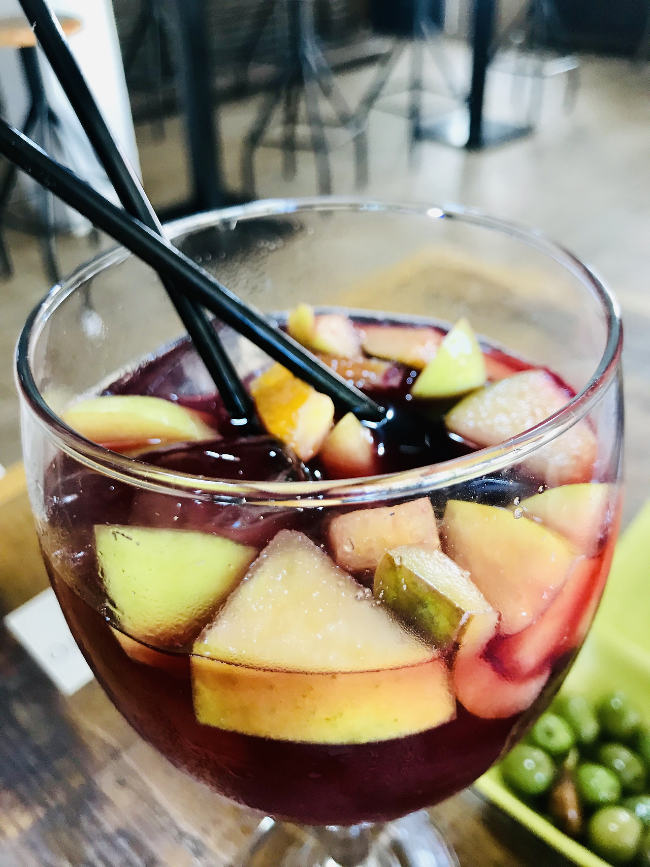 첫째는 샹그리아의 빨강. 빨간 사과가 둥근 떠다니는 빨간 샹그리아는 몇 분만에 자기 색깔로 사람 볼을 물들이는 능력이 있다. 빠른 시간에 세비야에 적응시켜 주는 가성비 높은 아이템이다. 세비야답게도 한 잔 시켰더니 막걸리 두 사발정도의 양이 나온다.