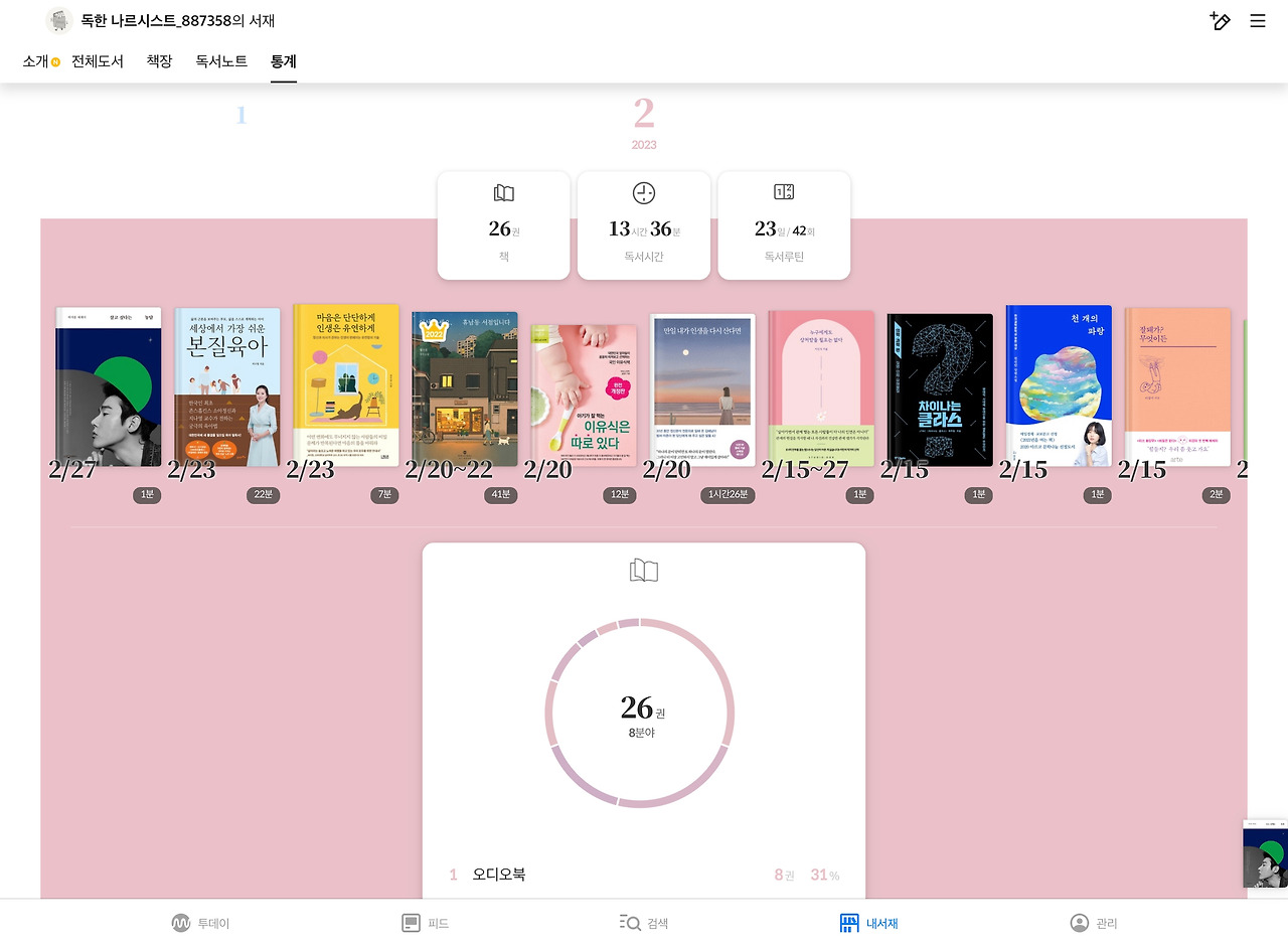 제이가 6개월이 되어가고 밀리의 서재를 구독하기 시작한지 한달이 되어간다. 2월의 마지막날이 다가오는 오늘 밀리의 서재가 결재되었다는 카톡을 받고 2월 통계에 들어가 보았다.