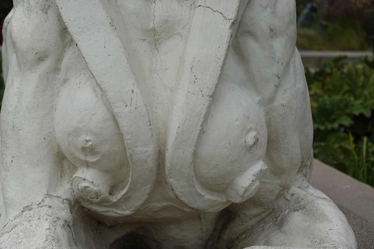사람 얼굴을 한 사자 모형 앞에서 사진을 찍었다.