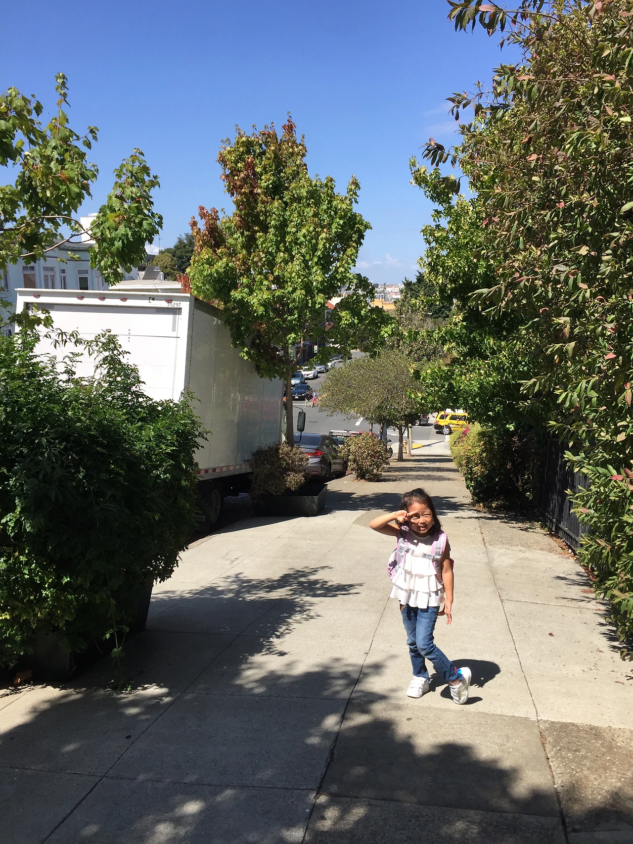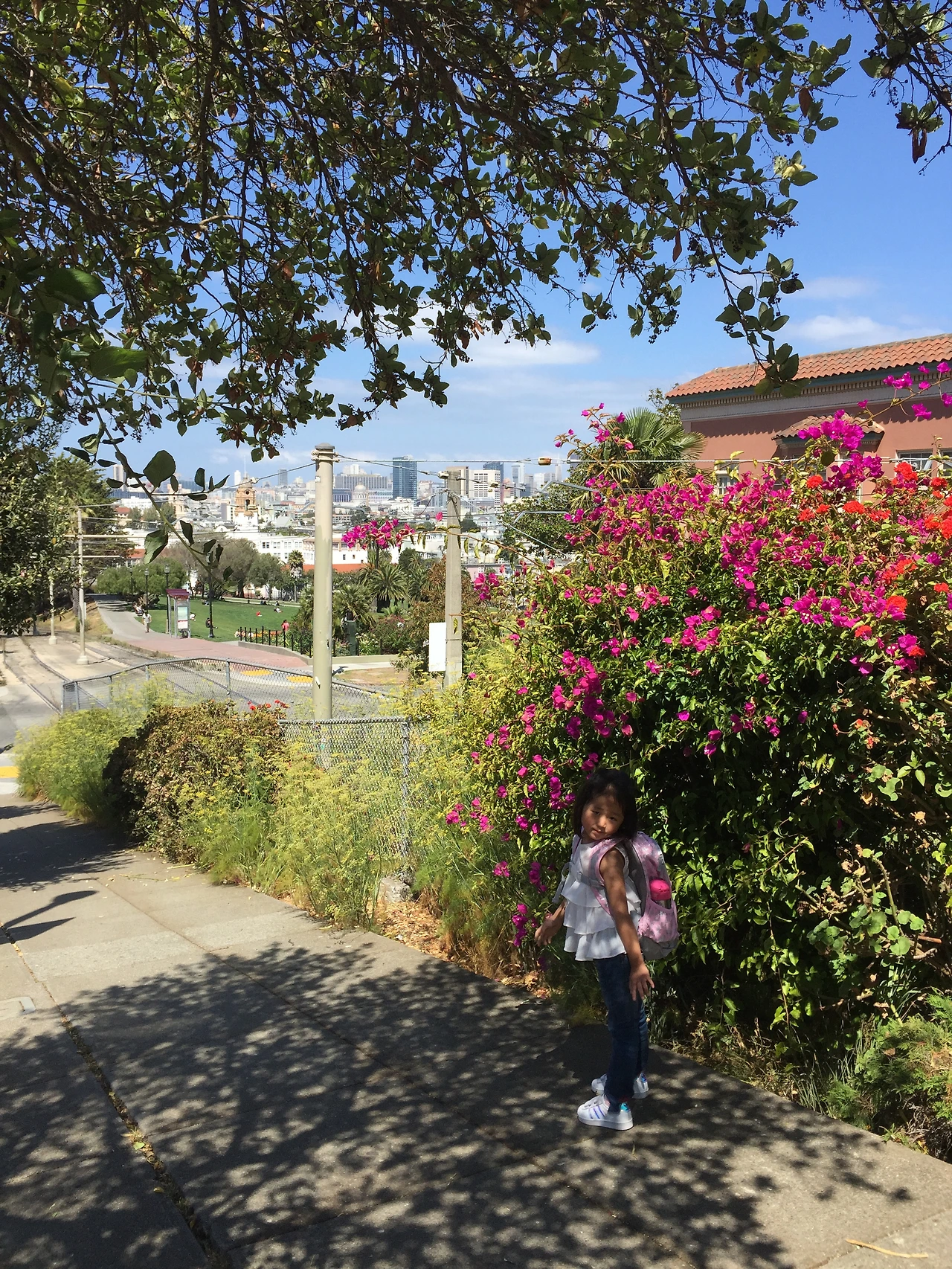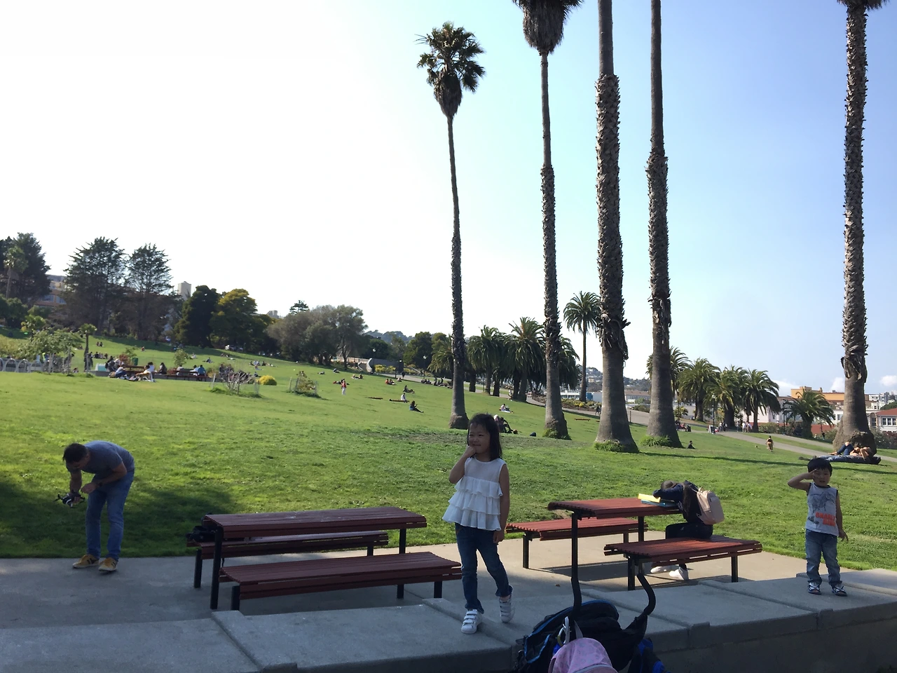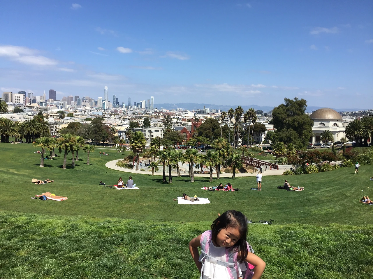 이 풍경을 어떻게 하면 눈에 보이는 대로 멋지게 찍을 수 있을까. 가파른 언덕길. 밑으로 보이는 넓고 푸른 잔디밭. 그 너머에 뾰족뾰족 선 높은 건물들. 그 뒤로 보이는 푸른 바다. 시종일관 표정으로 짜증을 발산하고 있는 진우에게 사진 찍자고 하면 짜증이 울음으로 폭발할 것만 같아 소윤이만 모델로 세웠다. 가파른 언덕이 잘 나오기를. 그 밑에 공원도 잘 나오고. 그 너머 샌프란시스코 전경과 그 뒤의 바다도 잘 나오기를.