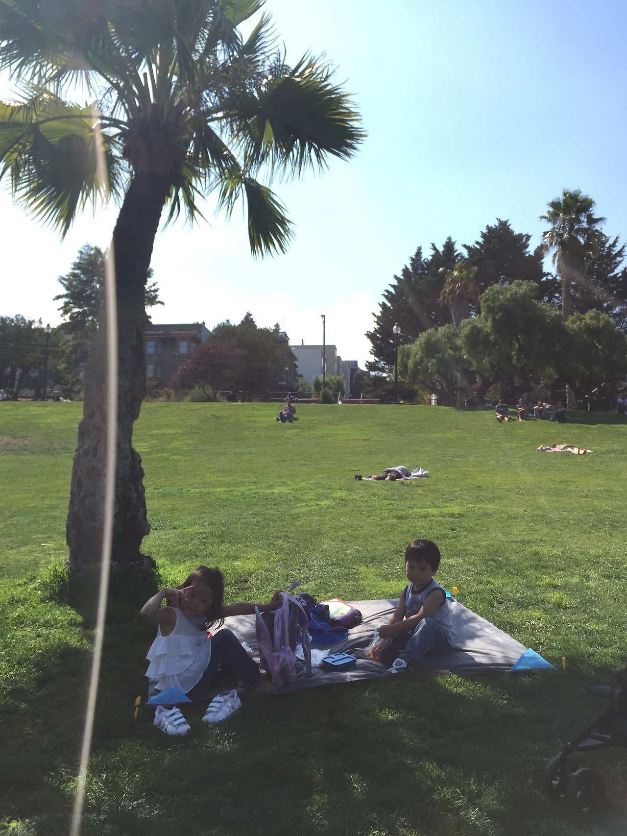 큰 개를 데리고 온 꼭 껴안고 있는 커플 옆, 열심히 무엇인가를 썼다 지웠다 하는 여학생 뒤, 혼자 맥주인지 와인인지 마시고 엎드려계신 할아버지 옆, 그리고 우리가 앉을 만한 크기의 그늘을 만들어 주고 있는 팜트리 밑에 돗자리를 폈다.
