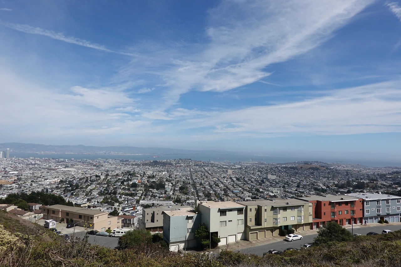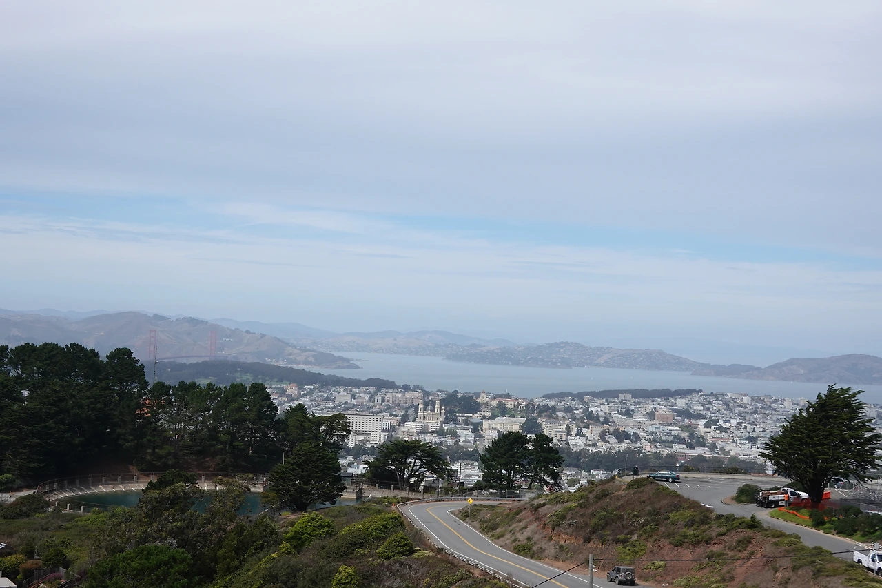 바람이 많이 불어 안개를 다 날려 버린 모양이다. 멀리까지 툭 터진 시야가 마음까지 툭 터지게 만든다. 멀리 태평양에 떠 있는 색색깔의 배들, 바둑판의 격자무늬처럼 질서 정연하게 늘어선 집들, 저 멀리 보이는 빨간 금문교, 하늘을 찌르는 높다란 건물들이 오밀조밀 모여있는 샌프란시스코 시내.