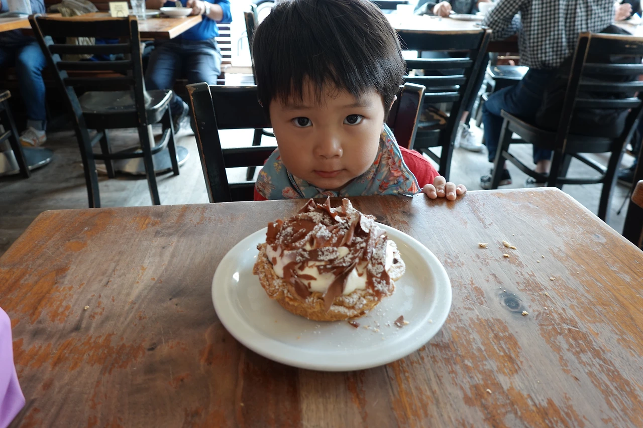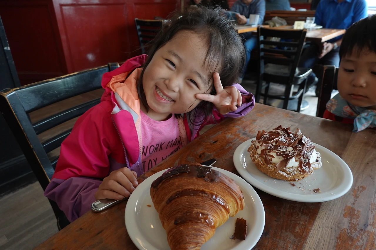 바나나 크림 타르트 한 조각과 커피 한 모금은 가격과는 다르게 황홀했다. 소진 남매도 맛있는지 큰 크라상을 다 먹어치웠다. 생크림 위에 얇게 썬 초콜릿 토핑, 그 밑은 부드러운 바나나 크림, 그 안에 큼직큼직 썰어진 바나나, 그 밑엔 다크 초콜릿이 코팅된 쌉싸름하고 바삭한 쿠키. 처음 먹어본 달콤 쌉싸름한 그 맛은 비싸더라도 다음에 또 오고 싶은 맛이었다.