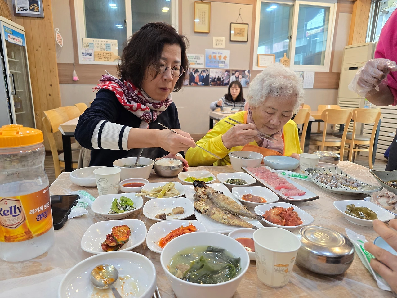 2박 3일은 아주 짧았다. 돌아오는 날 목포에서 유명한 맛집을 찾아갔다. 역 앞에 있는 오래된 백반집이었다. 조기구이 갈치조림 미역국 여러 종류의 정도의 반찬이 나왔다. 써빙은 머리가 하얀, 얼굴만 노인이신 가게 사장이하셨다. 은색의 머리카락색만으론 나의 엄니와 비슷한 연배이신 사장할아버지는 쉴 새 없는 말붙임으로 우리를 웃게 만들었다. 서빙 중 배달주문이 들어오자 "쇤네 머슴이라 용달 좀 다녀오겠습니다 " 라며 울 엄니께 공손히 인사하고 다녀오셨다. 엄니 나이를 물어서 알려 드리니 구순잔치가 아니라 88세 미수잔치를 해드려야 한다고 했다. 9자가 들어가는 90세나 89세는 아홉수가 들어가서 안 해드린다는 설명이다. 미수잔치라니. 처음 듣는 낱말이고 유래였다. 오늘 처음 알았다고 놀라는 나를 보더니 주인할아버지가 한마디 하신다. "애들이 뭘 알겠어?!"....... 어제는 과자 먹는 것도 참아내는 다 큰 나, 오늘은 미수도 모르는 애들 틈에 낀 57세의 나를 발견한 여행이었다.
