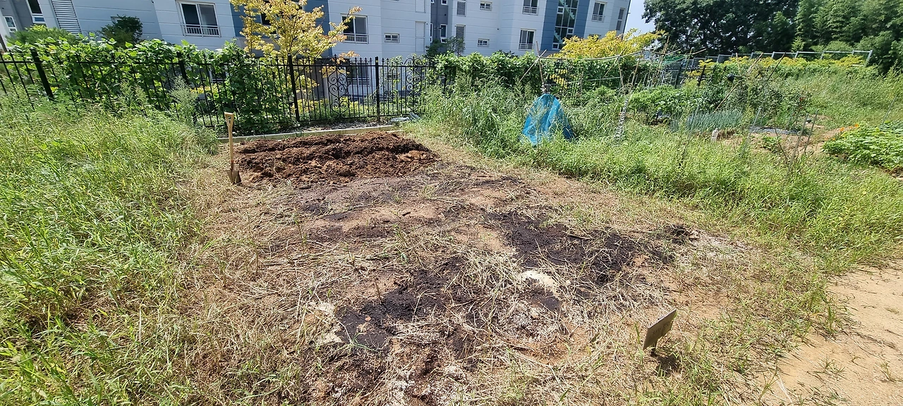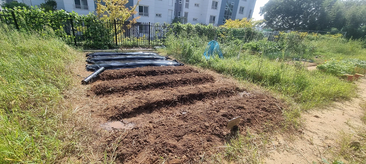 처음에 텃밭을 할 때 이랑을 너무 좁게 했더니 동선이 조금 어지러웠다. 이번엔 이랑을 좀 넓게 할 심산으로 옆에 텃밭을 해놓은 곳을 참고하여 고랑과 이랑을 팠다.