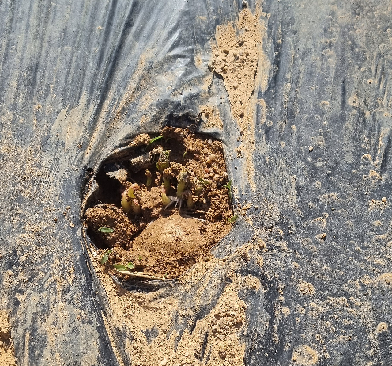 시간이 2주쯤 지났을까 멀칭 비닐 아래가 울퉁불퉁 해진다. 뭐지 하는 생각에 살짝 들춰 봤다.