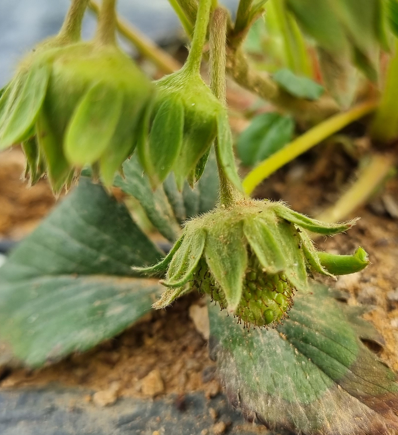 꽃이 핀 딸기가 자라고 어느새 꽃이 떨어져 있다.