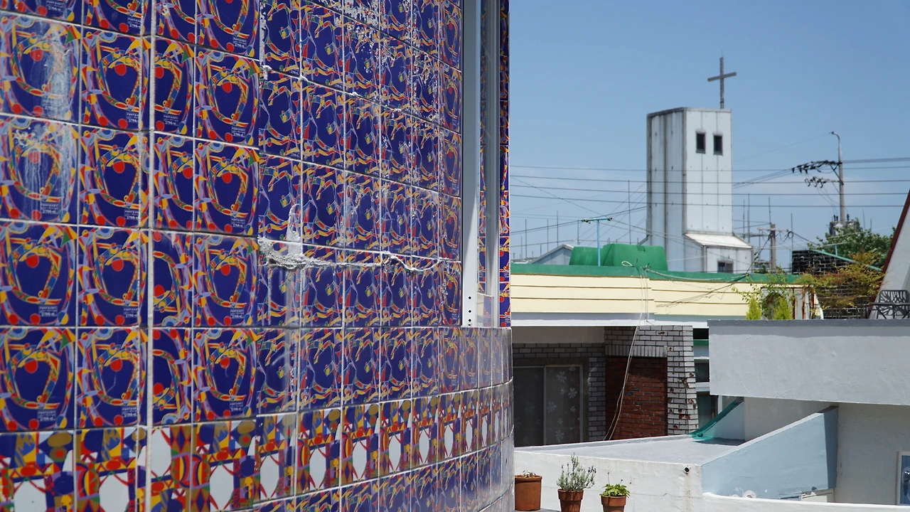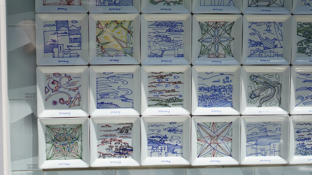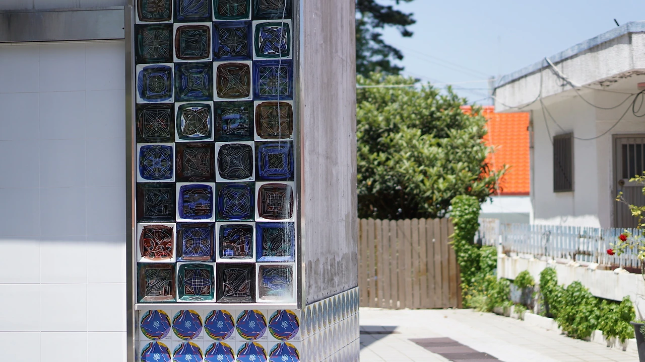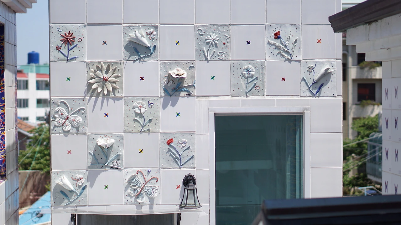 2층에서 나와 3층으로 올라가는 계단은 옥외로 연결되어 있습니다. 미술관 외벽을 장식하고 있던 타일들을 더 가까이에서 자세히 볼 수 있는 기회인데, 참 아름답습니다. 마지막의 사각접시가 반복되는 작품은 전영근 화백의 작품입니다. 주제 중에 통영이 제법 많이 등장하기도 하니 하나씩 찾아 보는 것도 재미있을 듯 합니다.