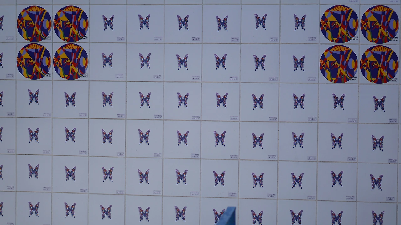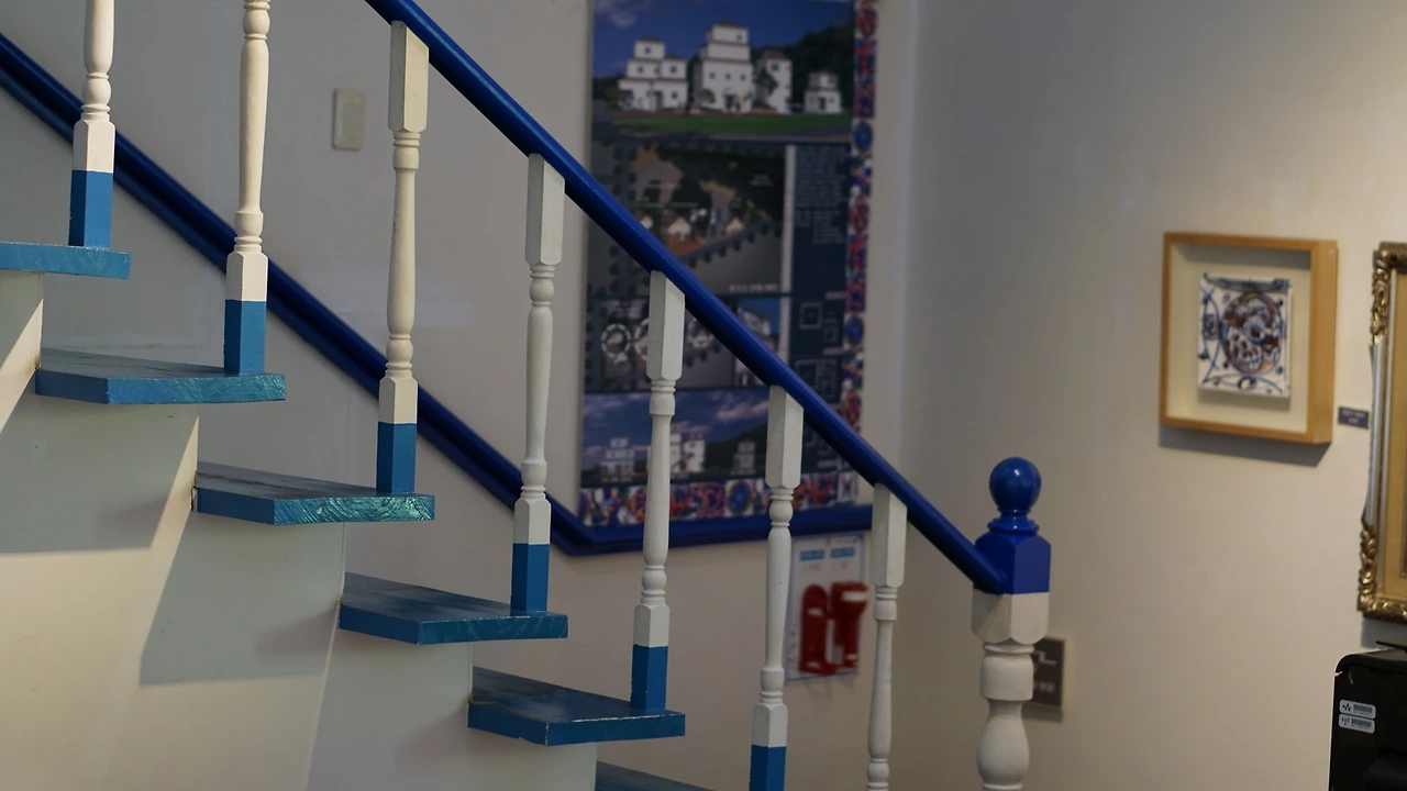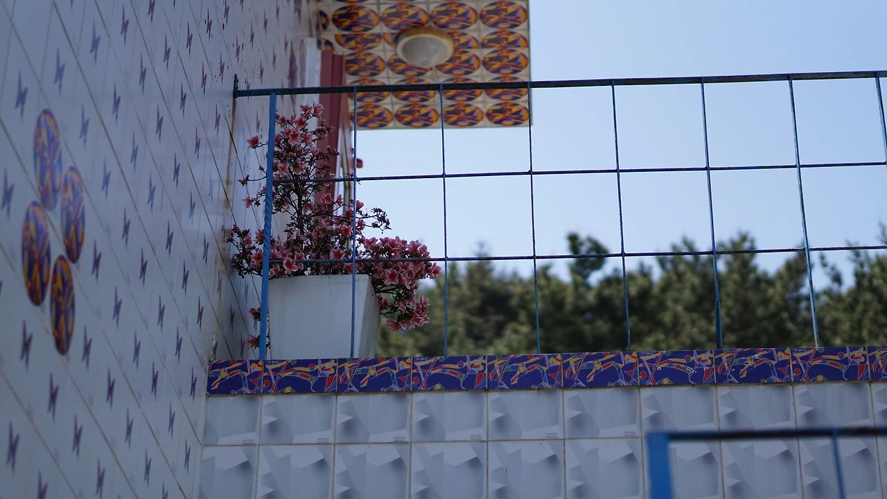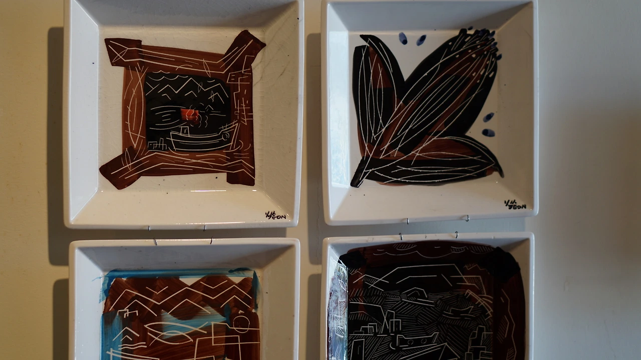2층에서 나와 3층으로 올라가는 계단은 옥외로 연결되어 있습니다. 미술관 외벽을 장식하고 있던 타일들을 더 가까이에서 자세히 볼 수 있는 기회인데, 참 아름답습니다. 마지막의 사각접시가 반복되는 작품은 전영근 화백의 작품입니다. 주제 중에 통영이 제법 많이 등장하기도 하니 하나씩 찾아 보는 것도 재미있을 듯 합니다.