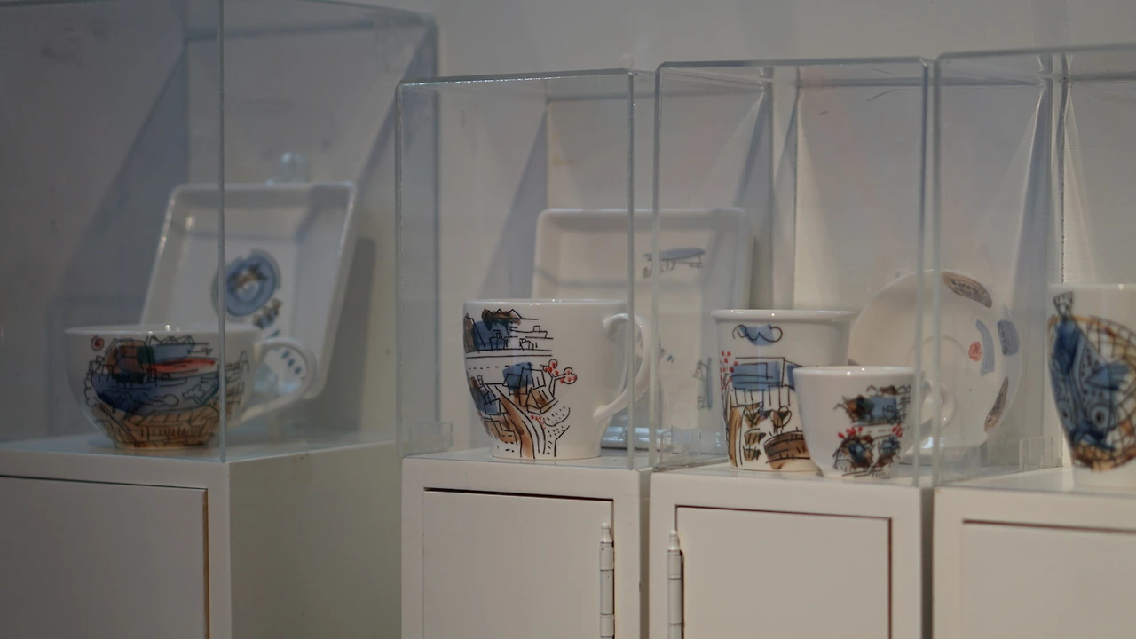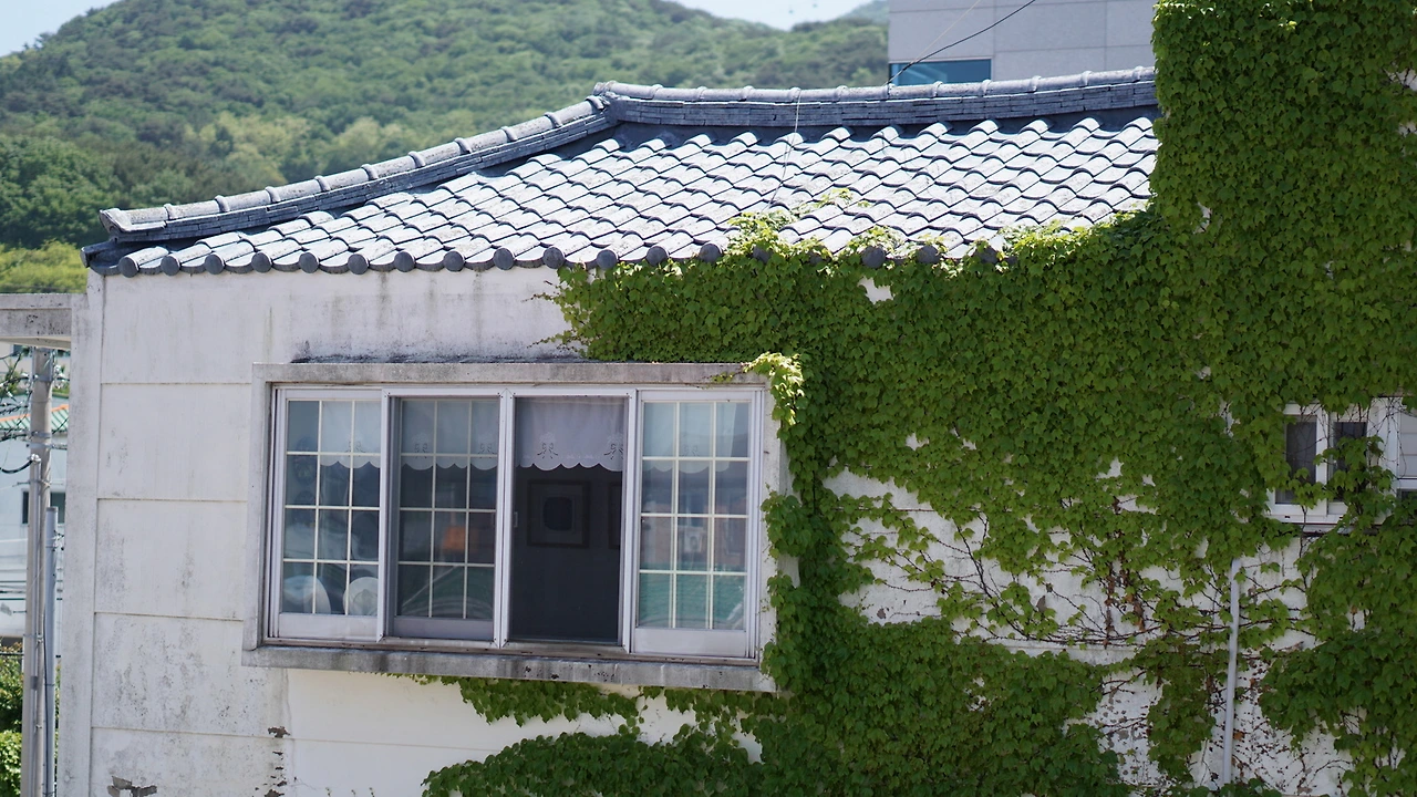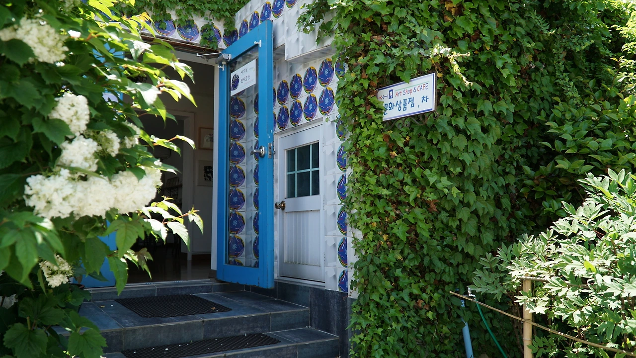 담쟁이덩굴이 무성하게 감싼 옆건물은 카페 겸 아트샵입니다. 판매하는 제품들은 전혁림 화백의 작품은 아니고, 그 아들인 전영근 화백의 작품입니다. 전혁림 화백의 그림과 작품들을 보고 나온 뒤에 기념품들로 팔고 있는 컵 등의 프린트에선 전영근 화백의 깔끔한 선을 보여주고 있어서 비교가 되는 재미가 있습니다.