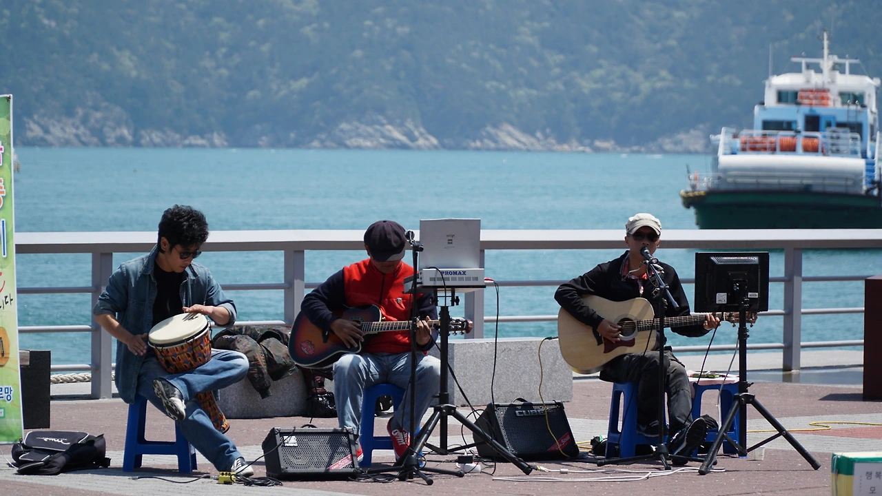 허브가 잔뜩 깔린 돌아가는 길에서 보니 장사도에서 나올 사람들을 태우려는 배들이 바다에 둥둥 떠서 자신들의 차례를 기다리고 있는 재미있는 광경이 보입니다. 나가는 부두에 도착하니 노래를 부르는 악공들이 반겨주고, 딱 맞춰서 제가 타고 왔던 배가 들어옵니다. 장사도 여행 끝~