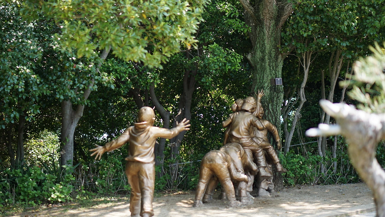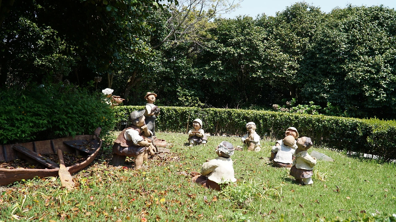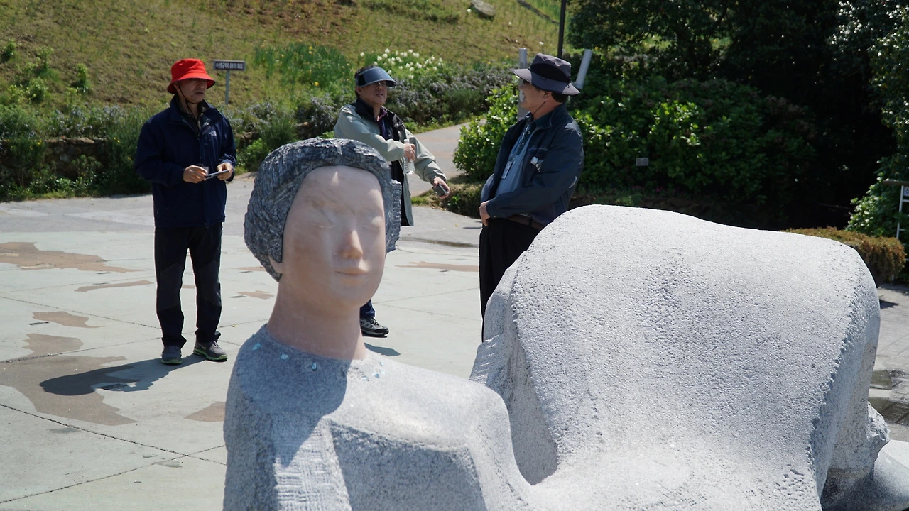오르막길 끝. 바다를 보는 조각상이 있고, 한 쪽에선 뽕잎 아이스크림을 팔고, 작은 광장 같은 곳이 나옵니다. 오른쪽 길로 들어가서 안내대로 돌면 됩니다.
