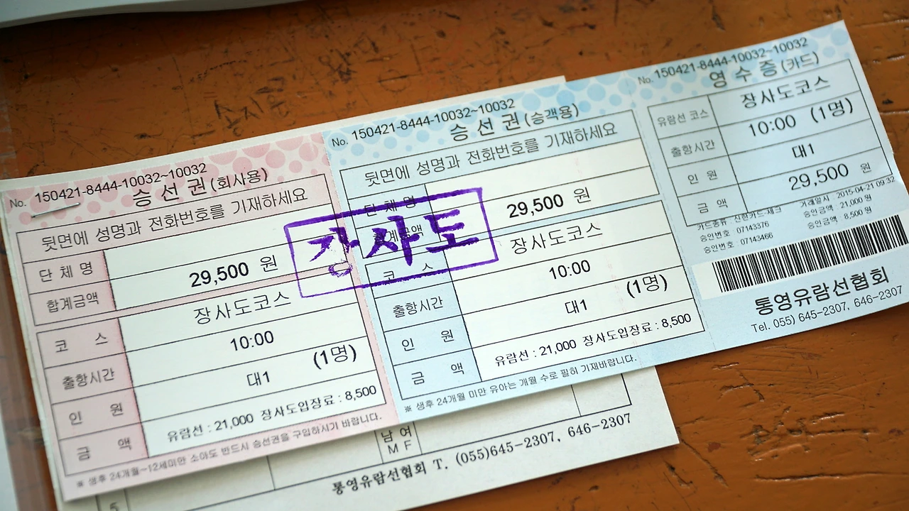 왕복 배삯과 공원 입장료를 포함해 총 29,500원이었습니다. 표 밑으로 보이는 종이는 승선계로 이름과 연락처 등 간단한 인적 사항을 적어야 표를 살 수 있습니다.