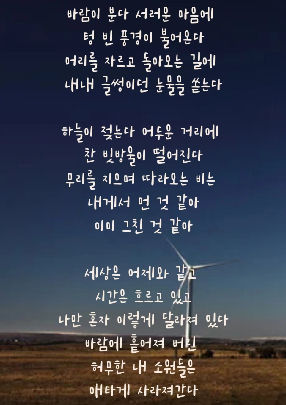노래를 듣다 보니 곡이 풍기는 분위기와 가사들이 마치 한강 작가의 작품에서 툭 튀어나온 듯 묘하게 겹친다는 생각이 들었다.