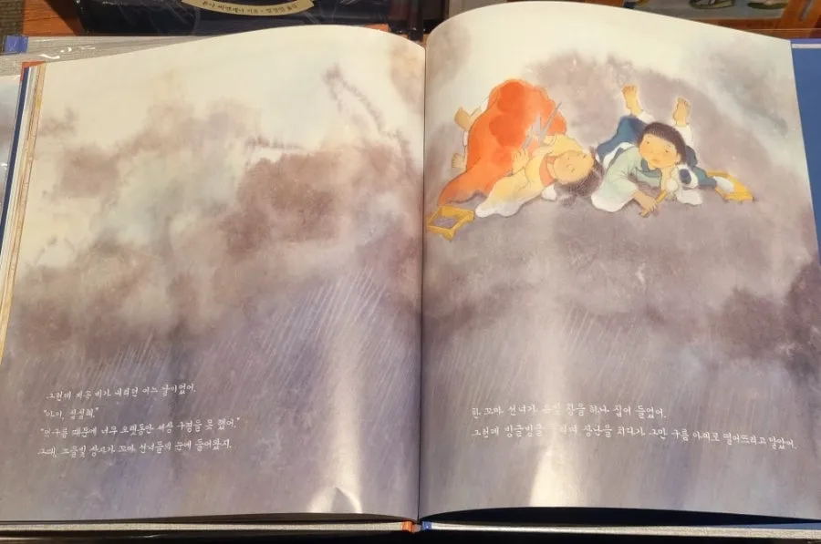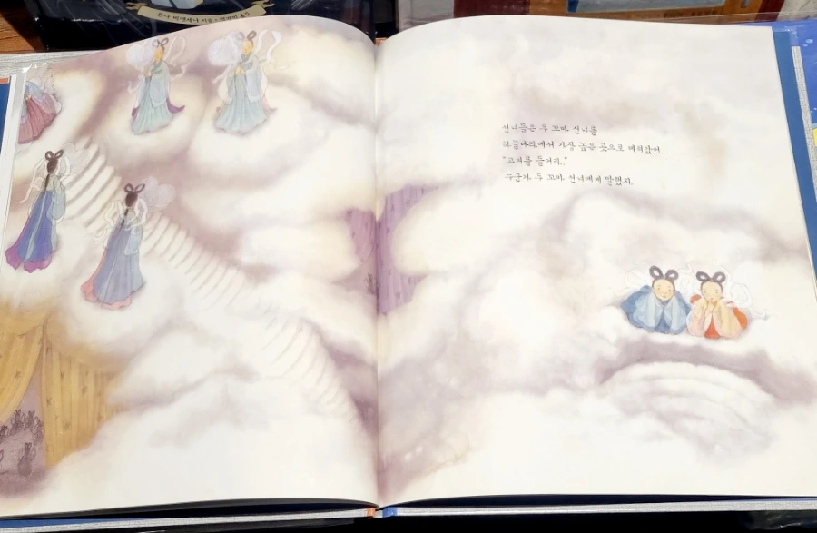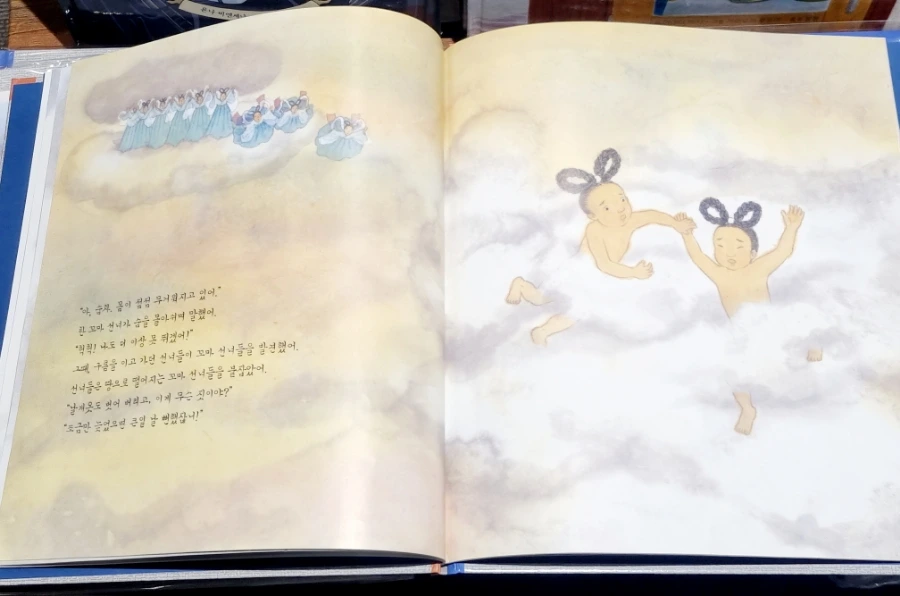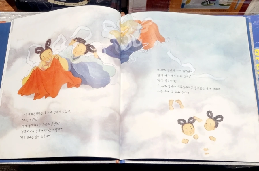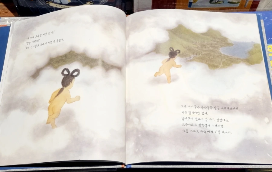 그때, 구름을 이고 가던 선녀들이 꼬마 선녀들을 발견했어.