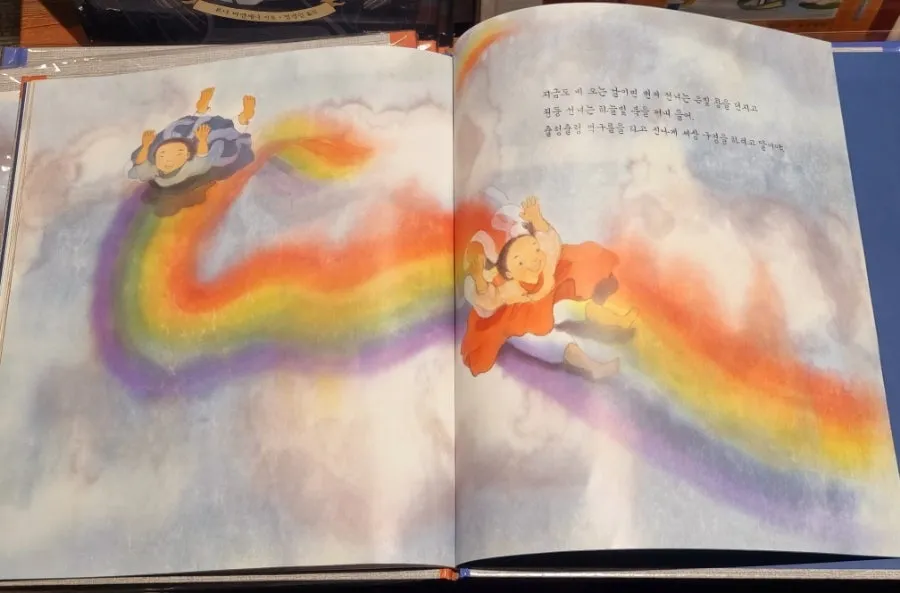 그걸 본 다른 꼬마 선녀는 하늘빛 북과 북채를 꺼내 힘껏 두드렸지.