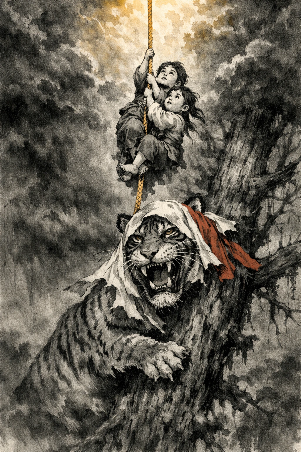 아이들의 기도가 바로 이것이다. 호랑이를 이길 힘이 없다. 도망칠 곳도 없다. 할 수 있는 것이 아무것도 없는 순간, 아이들은 하늘을 향해 말한다. "살려주세요"가 아니다. "새 동아줄을 내려주세요"다. 구체적 요청이다. 자기가 할 수 없는 것을 자기보다 더 큰 무언가에게 맡기는 행위. 자아가 자기에게 손을 내미는 순간이다.
