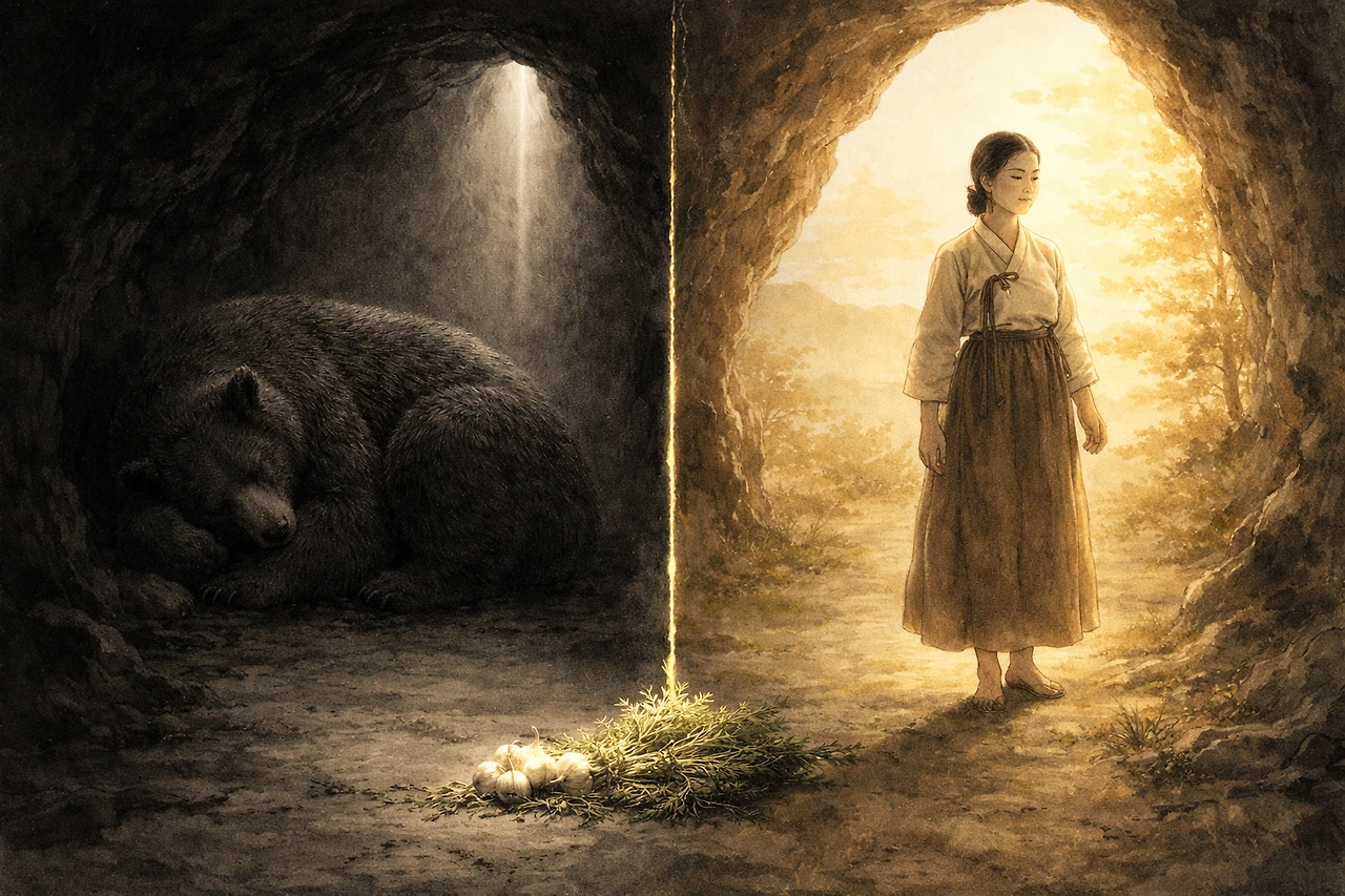 곰과 호랑이가 환웅을 찾아왔다. 인간이 되고 싶다고. 환웅은 조건을 내렸다 — 쑥과 마늘만 먹으며 백일 동안 햇빛을 보지 마라. 그러면 인간이 될 수 있다.