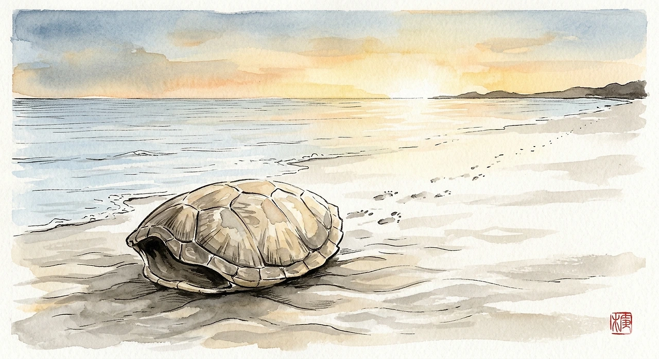 자라의 등이 갈라진 것은 — 전승에 따라 토끼를 놓쳐 벌을 받아 등이 갈라졌다고 한다 — 이 과잉 동일시의 물리적 결과다. 자기 자신을 잃어버린 채 역할만 수행하다가, 그 역할마저 실패했을 때 남는 것은 균열뿐이다.