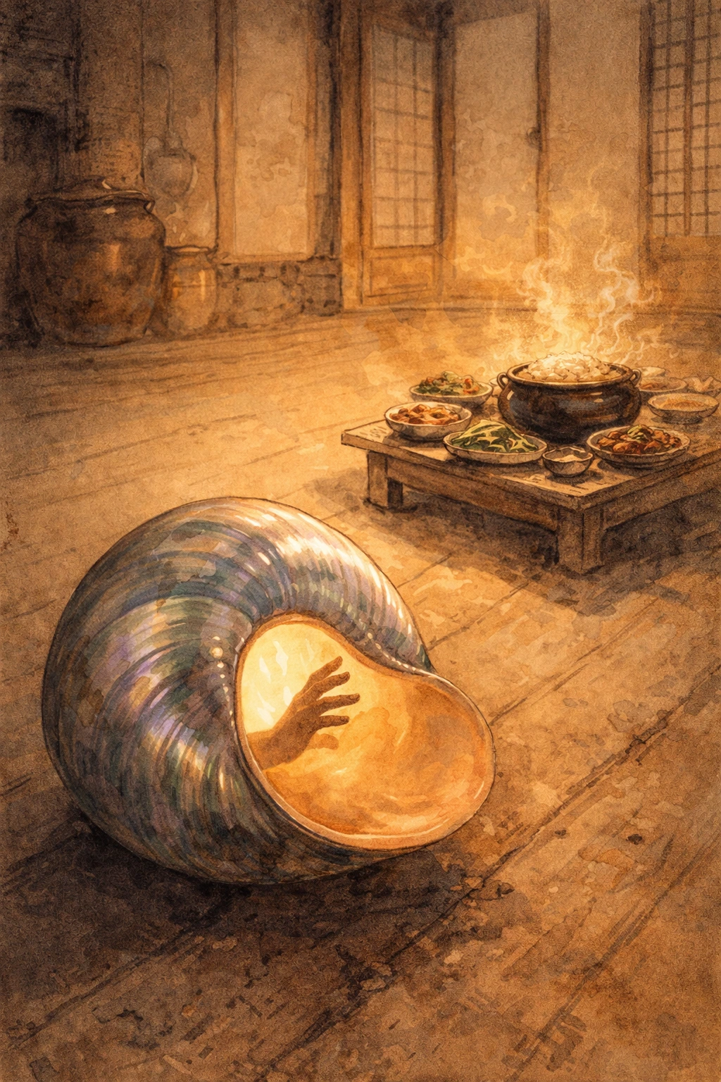 어느 날 논에서 커다란 우렁이를 하나 주웠다. 먹기엔 아까워 물독에 넣어두었다. 다음 날 들에서 돌아오니, 밥상이 차려져 있었다. 따끈한 밥, 정갈한 반찬. 다음 날도, 그다음 날도 같았다.